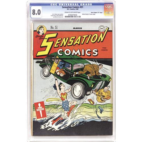 <B>Sensation Comics #51 Davis Crippen ("D" Copy) pedigree (DC, 1946) CGC VF 8.0 Cream to off-white pages.</B></I> Is it a coincidence that this H. G. Peter cover resembles the famous <B>Action Comics</B></I> #1? A fun fact to know and tell is that this issue saw the very last installment of the Black Pirate feature, which had debuted in the first issue of this series and appeared in almost every issue since. Still going strong were other characters who had been around since #1: Mr. Terrific, Wildcat, and Little Boy Blue (and of course Wonder Woman!). Overstreet 2006 VF 8.0 value = $275. CGC census 6/06: 1 in 8.0, 3 higher. <I>From the Crippen Collection.</B></I> <BR><BR><B>Important notice:</B> Heritage usually auctions material at the rate of 200-250 lots per hour. On some occasions eBay Live bid software or the Internet may not be able to keep up with the pace of the auction. We recommend placing a realistic absentee bid now as insurance to avoid disappointment. Occasionally the auctioneer may eliminate or reject an eBay Live bid, and the auctioneer may also reopen a lot after the close of the eBay live bidding (usually because we missed an audience bid), and may reject your bid even if it shows you as the winning bidder. By bidding via eBay Live, you agree that Heritage may award the lot to another bidder at its sole discretion under the circumstances described above or any other reasonable circumstances. Since eBay bids are not shown to us until we open the lot on the floor, we treat those bids just like floor bids. In most cases the floor responds before the eBay bid is presented to us, due to Internet lag time, so for consistency we have made it a policy that floor bids are always considered first over tie eBay live bids. Also please note that all Heritage lots purchased through eBay Live carry a 22.5% Buyer's Premium. Please make sure you read the Terms and Conditions before you bid. This lot is being auctioned in conjunction with a live floor auction by Heritage Auction Galleries. All final auction and invoice information will be supplied by Heritage Auction Galleries, and all other information should be considered preliminary. Lot:41001 <BR><BR><B>Winning Notification and Billing:</B> After the FINAL session in this auction is complete, Heritage will send e-mail and snail mail invoices. This process normally takes several days. All final auction and invoice information will be supplied by Heritage Auction Galleries, and all other information should be considered preliminary. <BR><BR>This auction will be conducted on a live auction floor and over the Internet through eBay Live. If you choose to place an absentee bid, please take a moment to <font color='#0000ff'><u><a href='http://pages.ebay.com/liveauctions/help/before/laabsentee.html'>learn how eBay Live absentee bidding works</a></u></font><font color='#000000'>