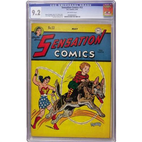 <B>Sensation Comics #53 (DC, 1946) CGC NM- 9.2 Off-white pages.</B></I> Sure looks like a pedigree copy, and it's one of the nicest that CGC has certified to date of issue #53. H. G. Peter cover and interior art is featured. Overstreet 2007 NM- 9.2 value = $650. CGC census 6/07: 3 in 9.2, 4 higher.<BR><BR><b>Shipping:</b> Comics - Slabbed (certified) (<a target="_blank" href="http://www.heritageauctions.com/common/shipping.php">view shipping information</a>)