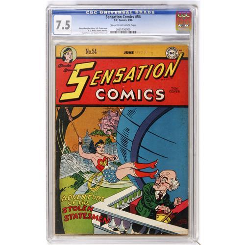<B>Sensation Comics #54 (DC, 1946) CGC VF- 7.5 Cream to off-white pages.</B></I> H.G. Peter cover and art. Dennis Neville, Frank Harry, and Stan Aschmeier art. Overstreet 2006 VF 8.0 value = $275. CGC census 3/07: 1 in 7.5, 1 higher.<BR><BR><b>Shipping:</b> Comics - Slabbed (certified) (<a target="_blank" href="http://www.heritageauctions.com/common/shipping.php">view shipping information</a>)