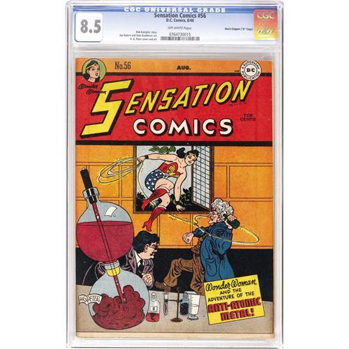 <B>Sensation Comics #56 Davis Crippen ("D" Copy) pedigree (DC, 1946) CGC VF+ 8.5 Off-white pages.</B></I> The usual H. G. Peter pizzazz characterizes this cover, and Wonder Woman's signature artist drew the Amazon's story inside the comic as well. DC great Joe Kubert drew the Sargon the Sorcerer backup feature. Other characters appearing include Little Boy Blue, Mr. Terrific, and Wildcat. Overstreet 2006 VF 8.0 value = $275; VF/NM 9.0 value = $430. CGC census 6/06: 1 in 8.5, 6 higher. <I>From the Crippen Collection.</B></I> <BR><BR><B>Important notice:</B> Heritage usually auctions material at the rate of 200-250 lots per hour. On some occasions eBay Live bid software or the Internet may not be able to keep up with the pace of the auction. We recommend placing a realistic absentee bid now as insurance to avoid disappointment. Occasionally the auctioneer may eliminate or reject an eBay Live bid, and the auctioneer may also reopen a lot after the close of the eBay live bidding (usually because we missed an audience bid), and may reject your bid even if it shows you as the winning bidder. By bidding via eBay Live, you agree that Heritage may award the lot to another bidder at its sole discretion under the circumstances described above or any other reasonable circumstances. Since eBay bids are not shown to us until we open the lot on the floor, we treat those bids just like floor bids. In most cases the floor responds before the eBay bid is presented to us, due to Internet lag time, so for consistency we have made it a policy that floor bids are always considered first over tie eBay live bids. Also please note that all Heritage lots purchased through eBay Live carry a 22.5% Buyer's Premium. Please make sure you read the Terms and Conditions before you bid. This lot is being auctioned in conjunction with a live floor auction by Heritage Auction Galleries. All final auction and invoice information will be supplied by Heritage Auction Galleries, and all other information should be considered preliminary. Lot:41001 <BR><BR><B>Winning Notification and Billing:</B> After the FINAL session in this auction is complete, Heritage will send e-mail and snail mail invoices. This process normally takes several days. All final auction and invoice information will be supplied by Heritage Auction Galleries, and all other information should be considered preliminary. <BR><BR>This auction will be conducted on a live auction floor and over the Internet through eBay Live. If you choose to place an absentee bid, please take a moment to <font color='#0000ff'><u><a href='http://pages.ebay.com/liveauctions/help/before/laabsentee.html'>learn how eBay Live absentee bidding works</a></u></font><font color='#000000'>