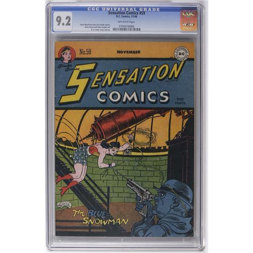 <B>Sensation Comics #59 (DC, 1946) CGC NM- 9.2 Off-white pages.</B></I> In this issue, Wonder Woman takes on the Blue Snow Man, who would later join with other villainesses to form Villainy Incorporated. Yes, we did just say villain<I>esses</B></I> -- there's more to the Blue Snow "Man" than meets the eye! The cover is by H. G. Peter. Overstreet 2006 NM- 9.2 value = $585. CGC census 3/06: 4 in 9.2, 2 higher.