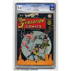 <B>Sensation Comics #73 (DC, 1948) CGC VF/NM 9.0 Off-white pages.</B></I> Wonder Woman shows one of the 1,001 uses for a magic lasso on H. G. Peter's cover. Inside the book, Mr. Peter is joined by Paul Reinman, who drew the Sargon the Sorcerer feature. Only one copy of this issue has been certified with a higher grade by CGC to date. Overstreet 2004 VF/NM 9.0 value = $350; NM- 9.2 value = $460. CGC census 12/04: 1 in 9.0, 1 higher.
