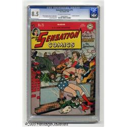 <B>Sensation Comics #75 (DC, 1948) CGC VF+ 8.5 Off-white to white pages.</B></I> Wonder Woman in action, H. G. Peter art, and "The Return of Shaggy the Leprechaun" -- what more could you ask for? The Wildcat backup story features an appearance by the Huntress (a villainess, not to be confused with the heroine of the same name). This is the only copy of this issue that CGC has certified to date. Overstreet 2004 VF 8.0 value = $240; VF/NM 9.0 value = $350.