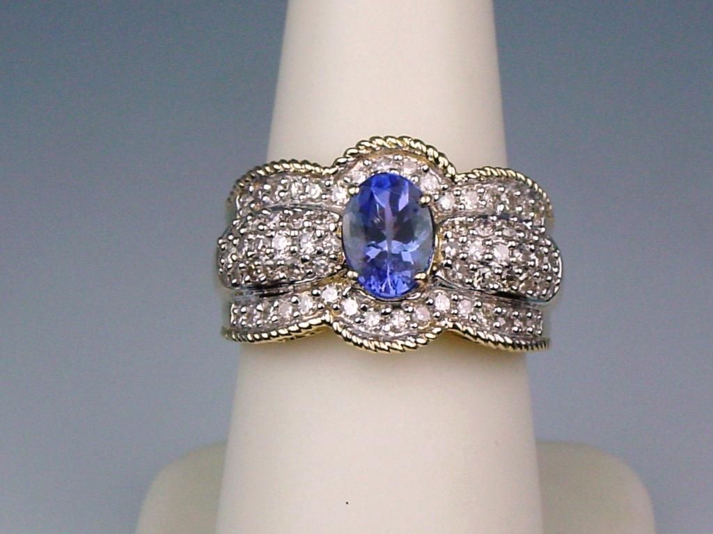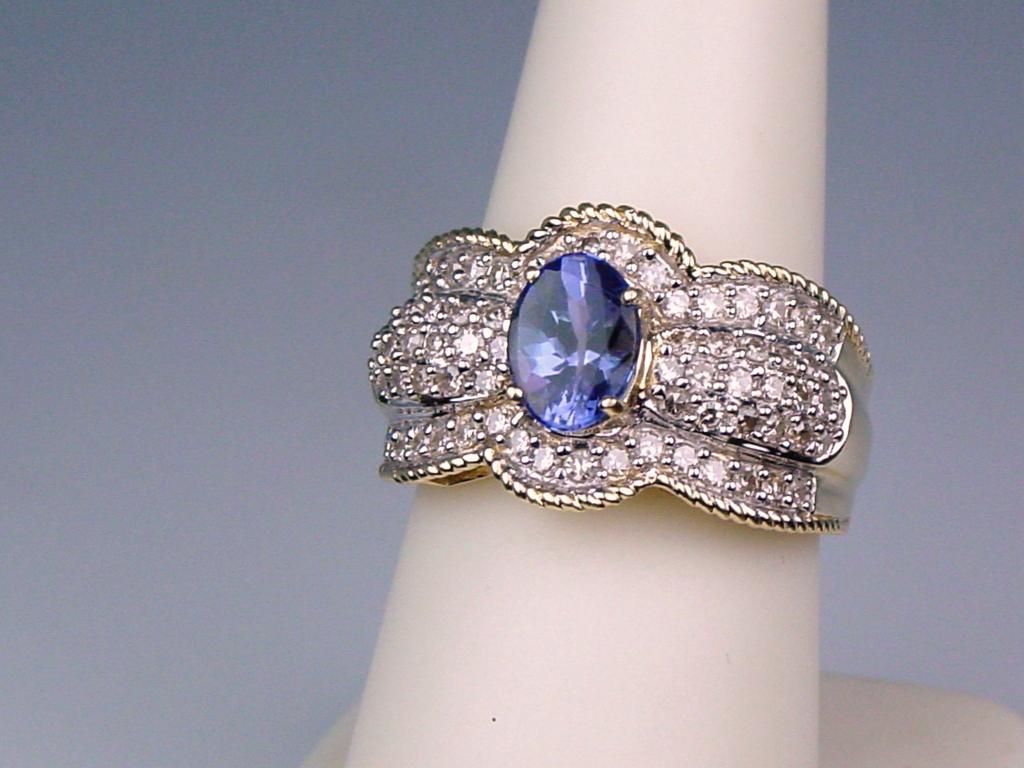 Sensational 14 karat two-tone gold ladies ring set with a center oval Tanzanite weighing approx. 1.00 carat and fine set with 70 round diamonds weighing approx. 1.50 carats of F-G colors and VS clarity. Retail$3,000-$4,000 Estimate $1,800-$2,500 Very labor intensive