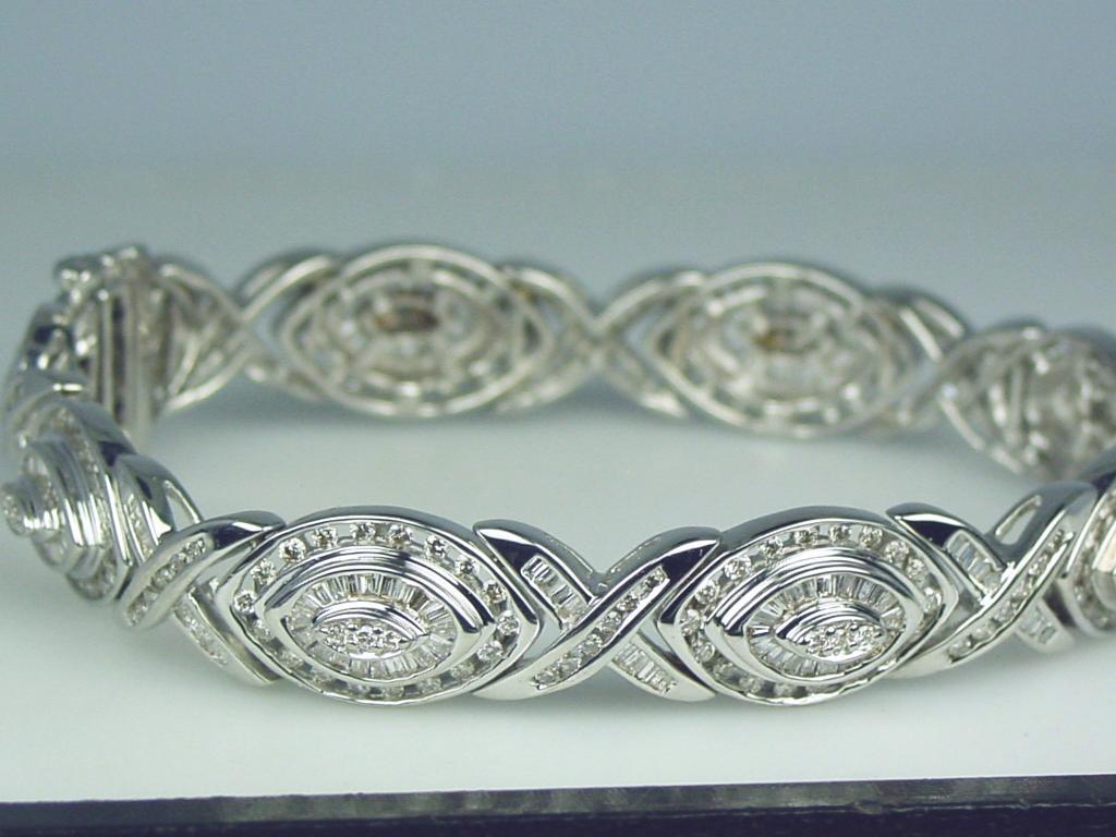 Sensational 14 karat white gold ladies custom made bracelet weighing over one ounce fine set with over 450 fine round and baguette cut diamonds weighing approx. 6.00-7.00 carats of H-I colors and mostly VS clarity. Approx.$1,500-2,000 labor just to set the diamonds. Retail $15,000-20,000. Est. $4,000-6,000