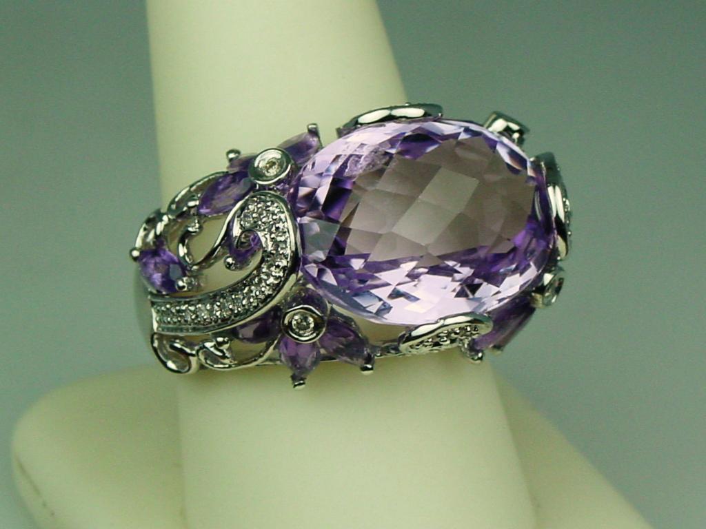 Sensational 14 karat white gold ladies custom made ring fine with a large checkerboard cut purple Amethyst weighing approx. 20.00 carats and fine set with 16 MQ cut Amethyst and pave set diamonds weighing approx. 2.00carats. Retail $2,950.00 Estimate $700-$1,500