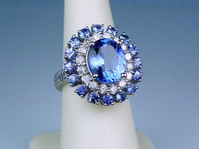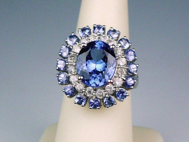 Sensational 14 karat white gold ladies ring set with a fine large oval Tanzanite weighing approx. 6.00 carats and surrounded by 32 round diamonds and Tanzanites weighing approx. 3.00 carats. Retail $5,000-$7,000Estimate $3,000-$4,000