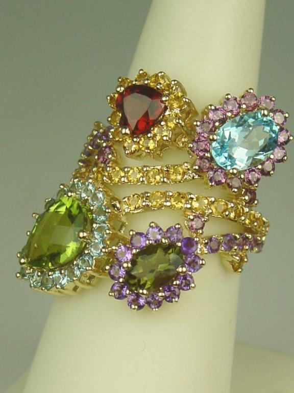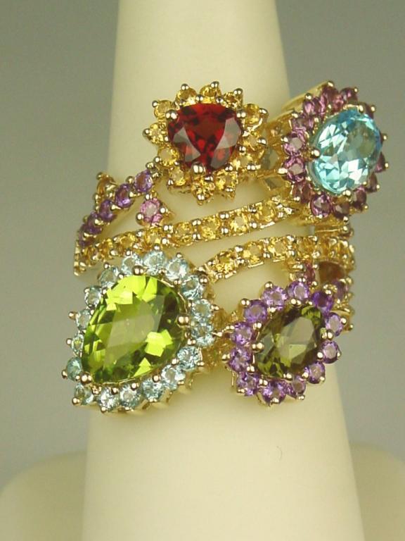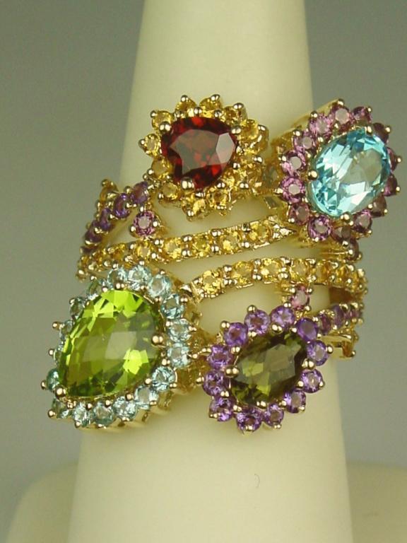 Sensational 14 karat yellow gold heavy ladies custom made ring fine set with a combination of Amethyst, peridot, blue topaz, garnet and citrines weighing approx. 6.00 carats. A fine item and very labor intensive. Retail$1,950.00 Estimate $600-$1,000
