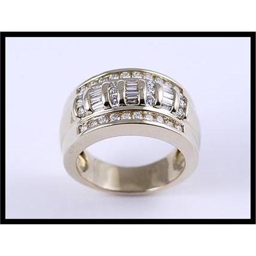 Sensational ring with 10 tapered baguette diamonds that weigh approximately 0.20 carats and 32 full cut diamonds that weigh approximately 0.65 carats set in 14k yellow gold. The size 7 ring measures 11.9 millimeters (0.47 inches) wide and weighs 10.30 grams total weight.