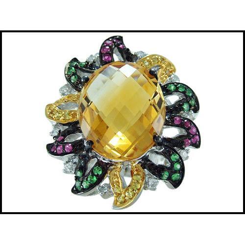 Sensational ring with 29 side sapphires that weigh approximately 0.30 carats, 18 garnets that weigh approximatley 0.10 carats, 10 side diamonds that weigha pproximately 0.10 carats, and 1 citrine that weighs approximately 7.20 carats set in 18K white gold. The size 7 ring measures 24 millimeters (15/16 inches) long x 29 millimeters (1-1/8 inches)wide x 27 millimeters (1-1/16 inches) high and weighs 9.00 grams total weight.