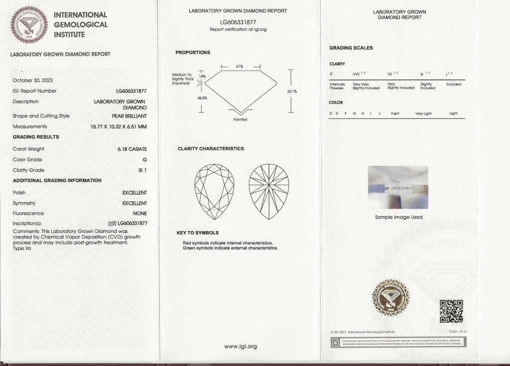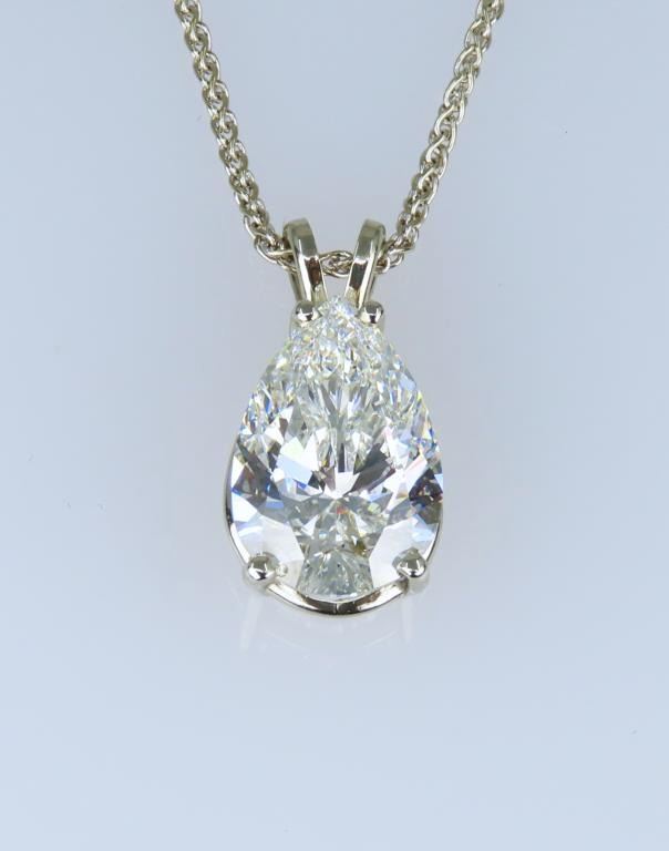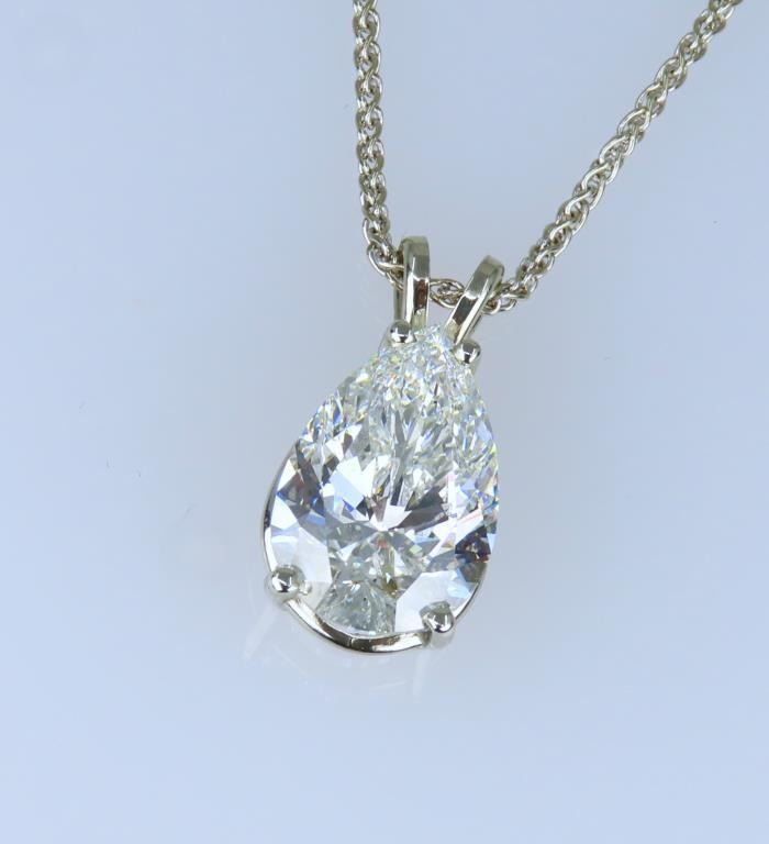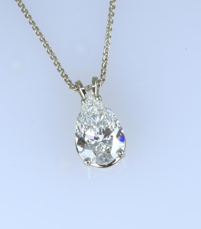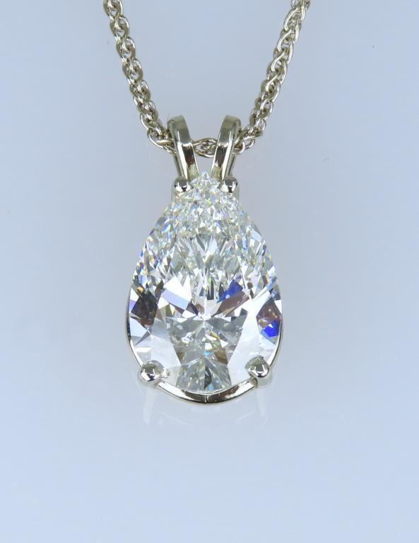 Pendant with Full I.G.I Report featuring a dazzling pear shape Diamond with G color and SI1 clarity set in a 14 karat white gold setting. Lab grown Diamonds are Genuine Diamonds grown in a laboratory; science speeds up nature’s process and have the same natural features as earth grown Diamonds. Compare to Earth Grown 6.00 carat Diamond approx. $150,000.00 and BLUE NILE Lab Grown 6.18 carat Diamond approx. $10,000.00