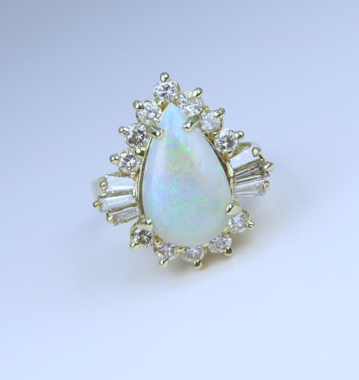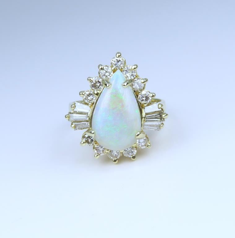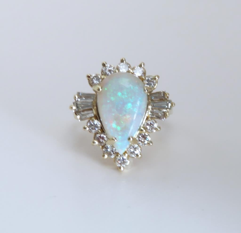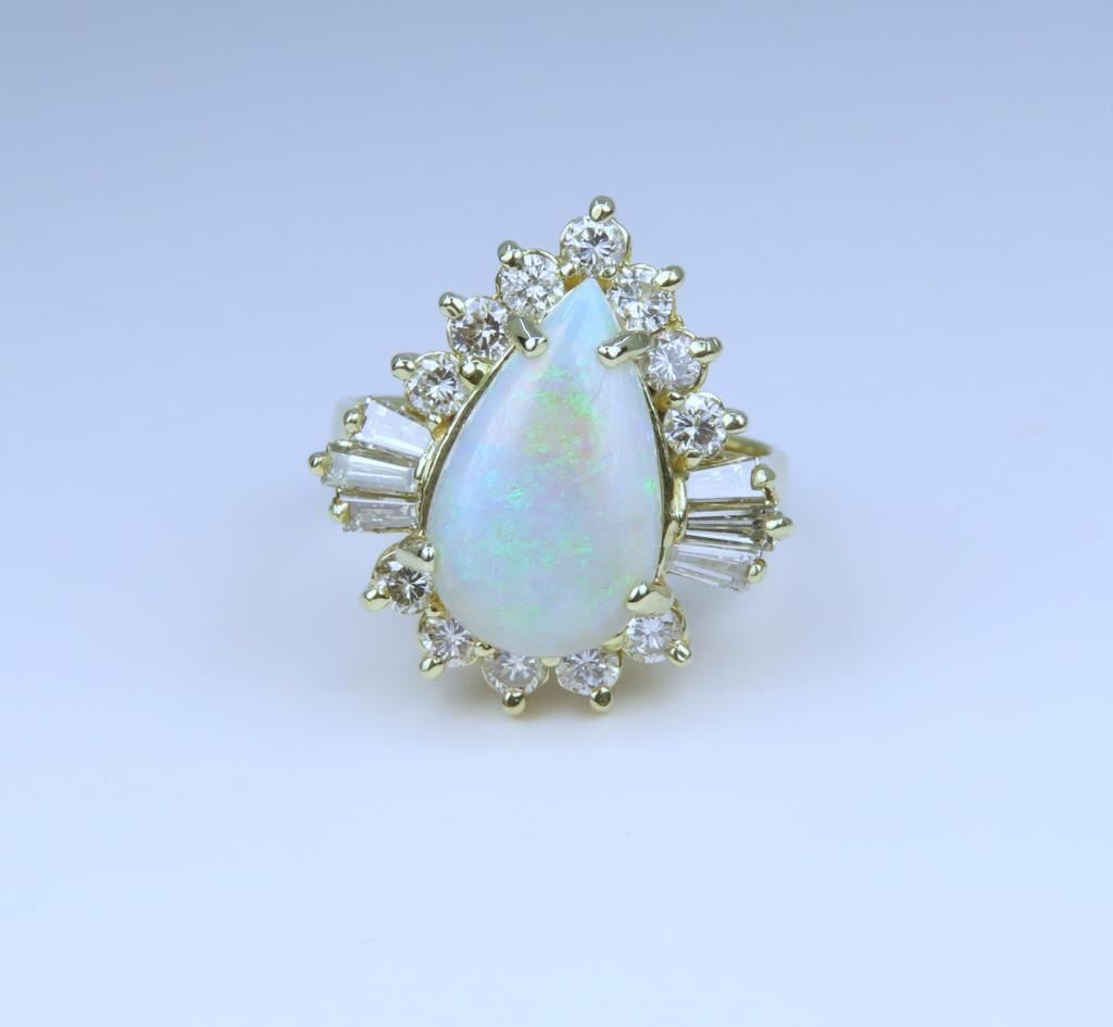 Ring featuring a pear shape Opal weighing approx. 6.00 carats illuminated with flashes of blue and green is beautifully framed with 18 round and baguette cut Diamonds weighing approx. 1.00 carat total with G-H colors and VS clarity set in an elegant 14 karat yellow gold setting, ring size 8. Retail $6,000-$9,000