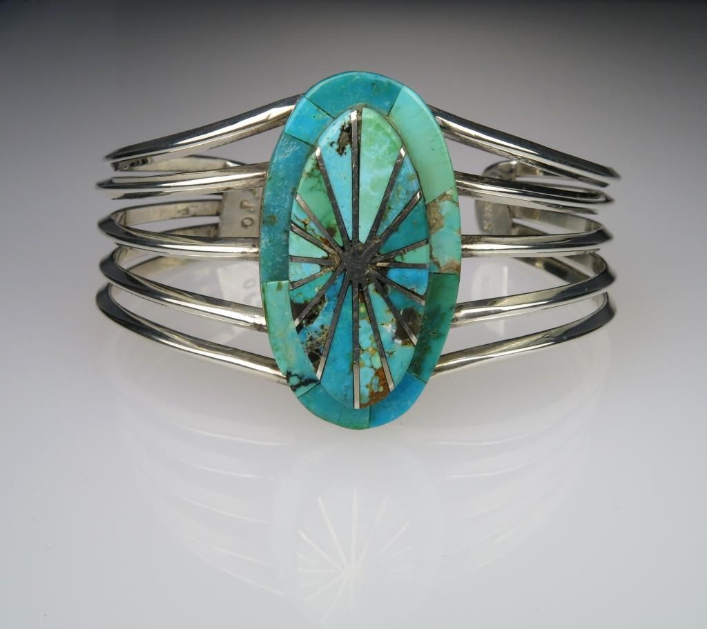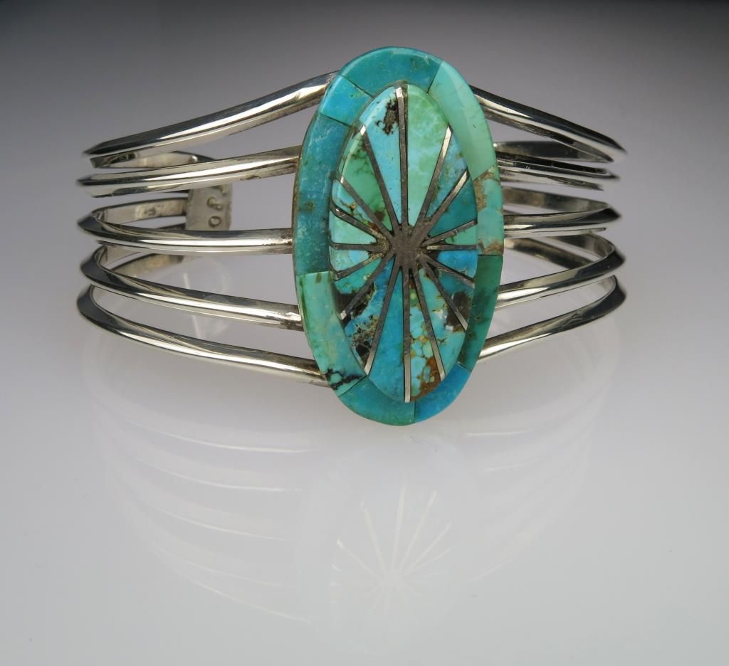 Sensational Contemporary Style Inlayed Turquoise Bracelet made of 44 grams of Sterling Silver with artist Hallmark T.J.O. Retail $300-$400 Estimate $200-$300