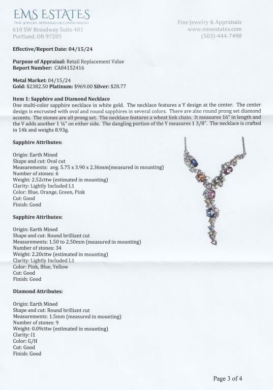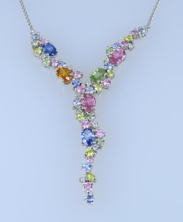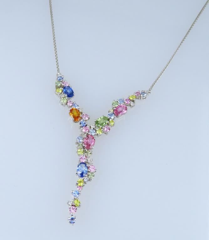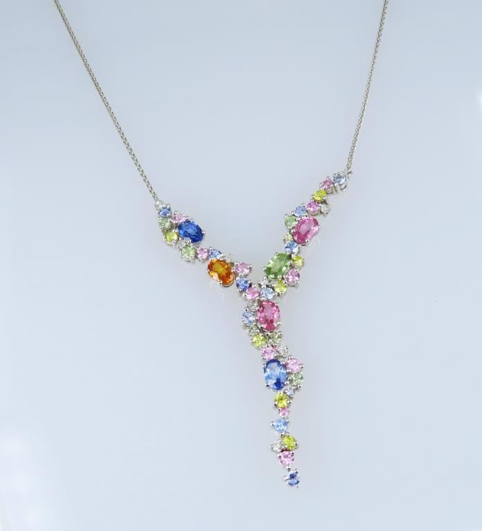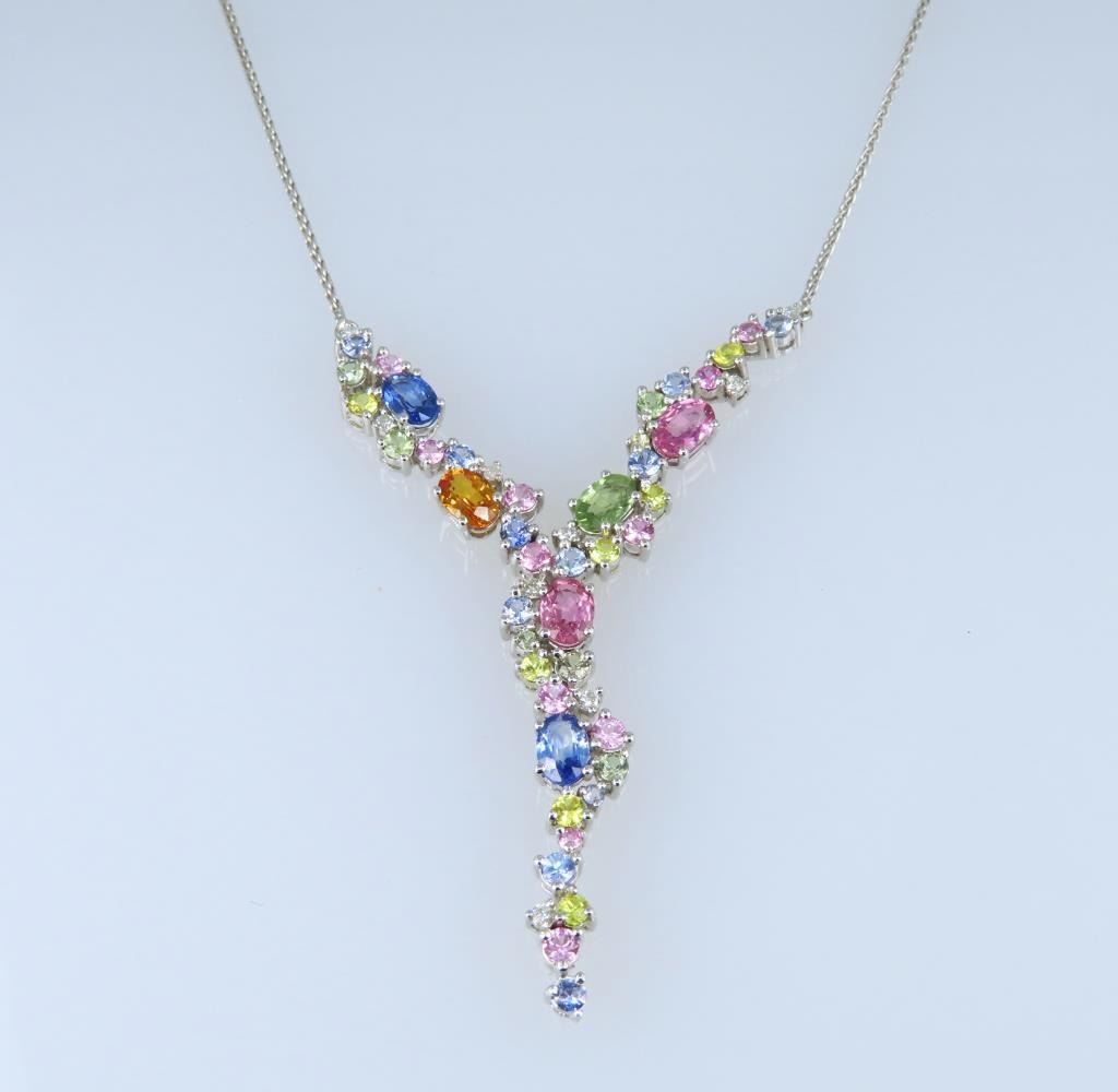 Necklace featuring 40 natural oval and round cut Sapphires in Blue, Pink, Orange, Green and Yellow accented with 9 Diamonds with a total Gem weight of approx. 4.81 carats. Gems are set in a beautiful cascading design impeccably crafted in 14 karat white gold. Full Appraised Retail Value - $10,000.00
