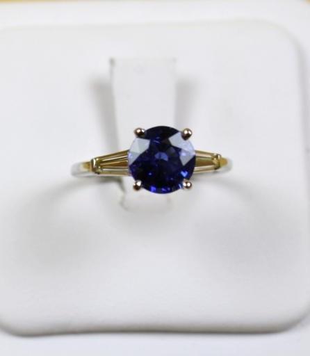 Sensational ladies Platinum ring set with a center round Ceylon type color sapphire 2.26 carats and side tapered baguette cut diamonds of H-I colors and VS clarity weighing approx. 0.40 carats. Retail $8,800.00Estimate $2,000-$3,000 Please see FULL appraisal