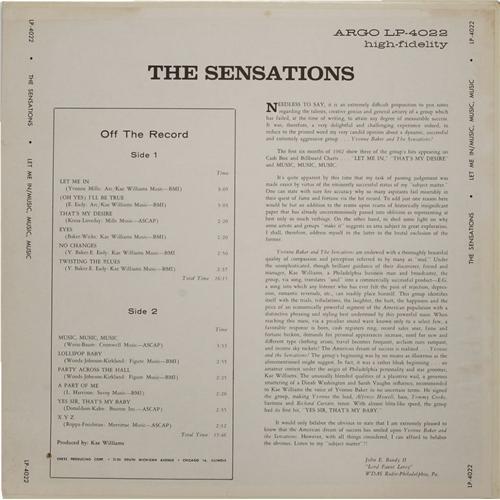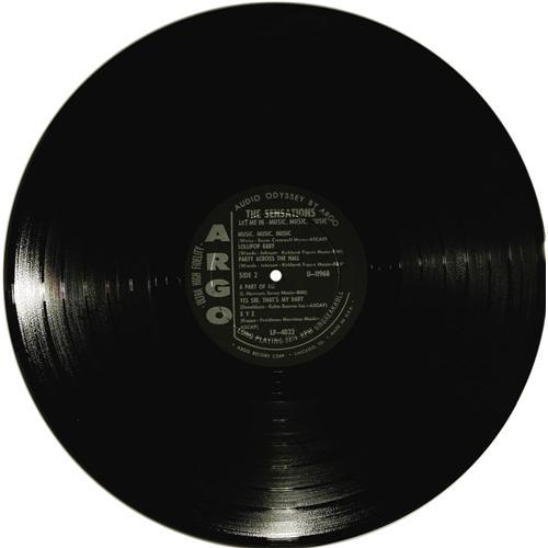 <B>Sensations "Let Me In / Music, Music, Music" Mono LP (Argo 4022, 1963).</B></I> The R&B vocal group had a minor it with "Music, Music, Music" in 1961, but hit it back with "Let Me In" in early 1962, one of the catchiest tunes of that (or any other) era. The album that contains both of these tunes, turned out to be the group's one and only, and it's a tough find in nice shape. On this copy the cover has a small hole in the bottom right corner; otherwise it would grade as high as the record itself. Condition: EX 7/ NM 8. <I>From the GRT Collection</B></I>.<BR><BR><b>Shipping:</b> Recordings (<a target="_blank" href="http://www.heritageauctions.com/common/shipping.php">view shipping information</a>)