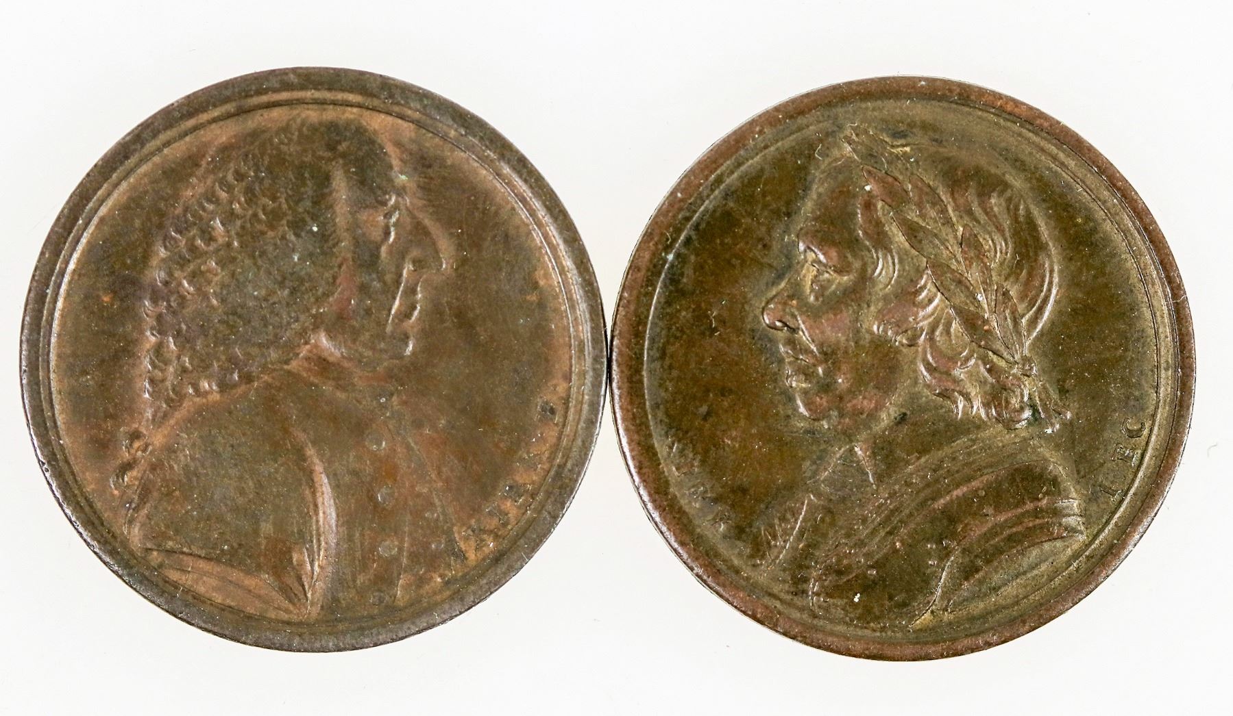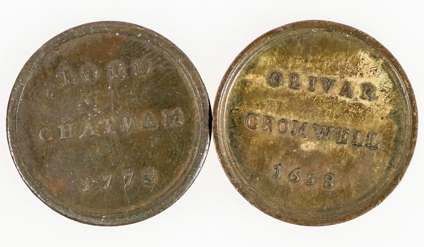 Sentimentalist tokens refers to the copper medals made by The Sentimental Magazine in London, 1773-75. The 13 different medals were 25 mm in size, featuring a bust of a famous person and their name on the reverse. Lot of two: 1) Oliver Cromwell; Betts 522 (1773-1775); 2) Lord Chatham (1773).