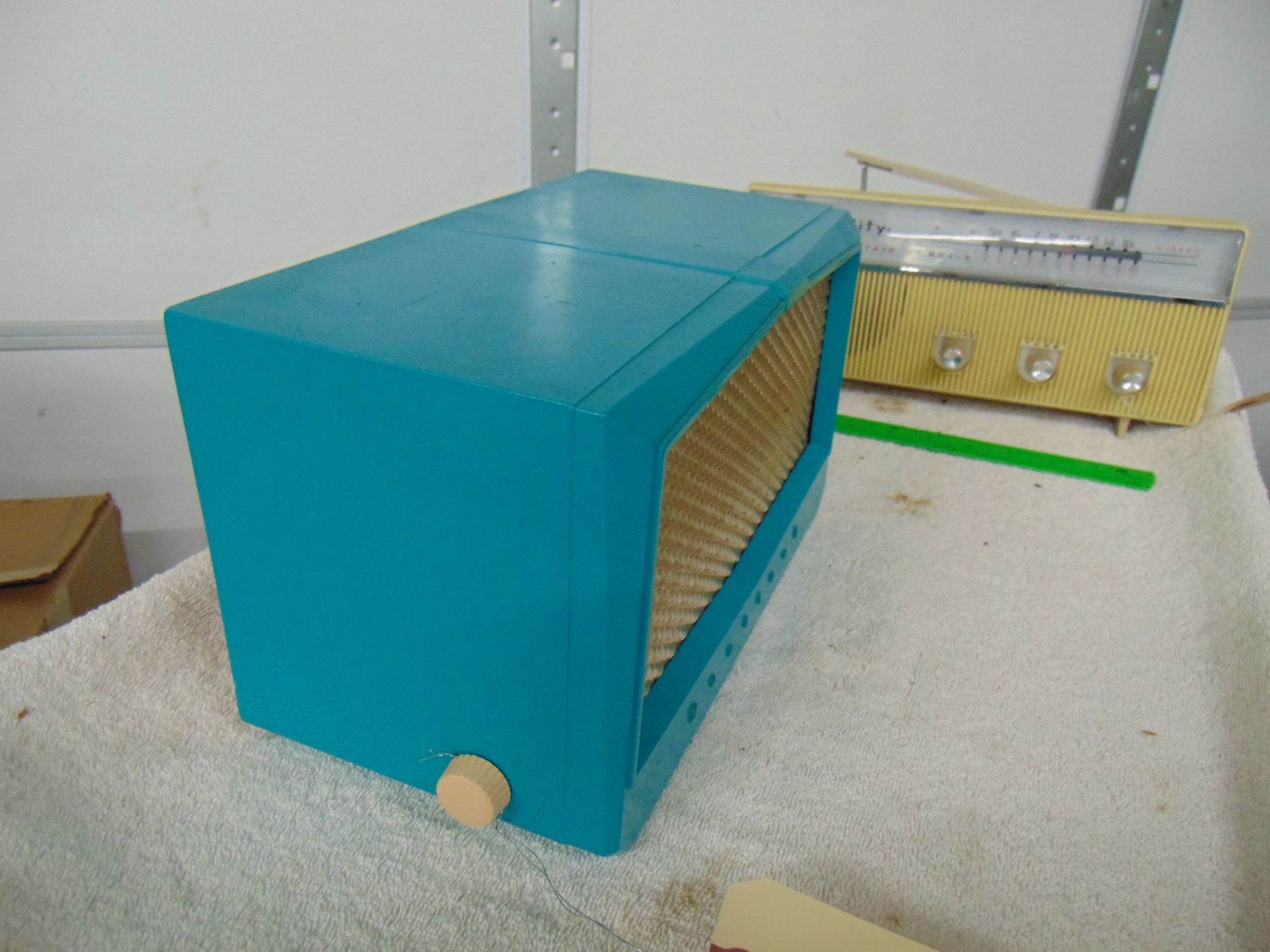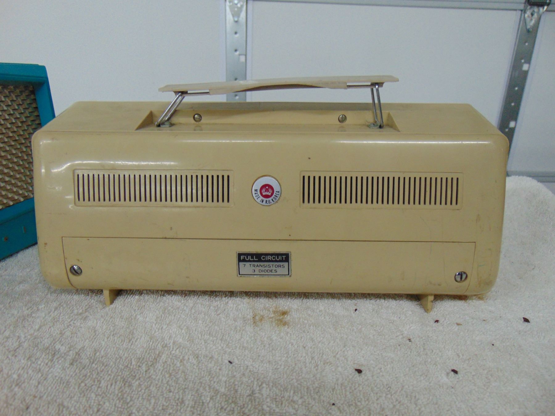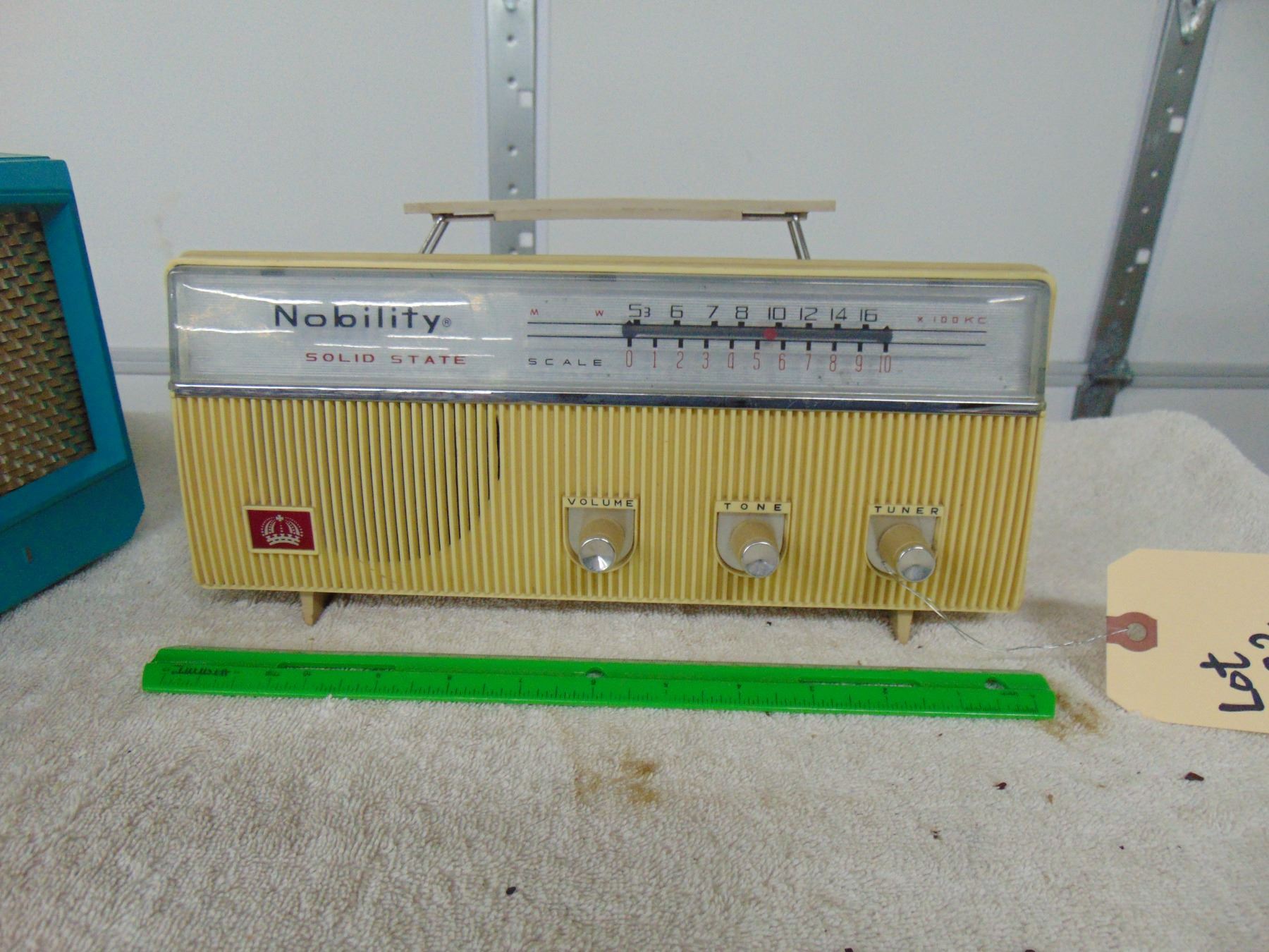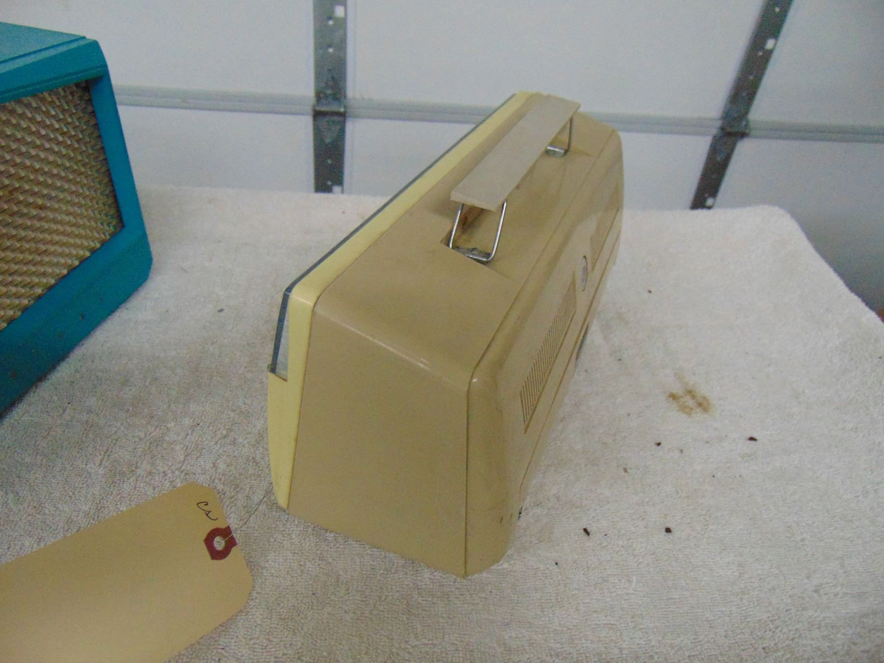 Blue bakelite table set, model 1U-356, break on bottom right hand corner, works; ALSO, Nobility portable transistor