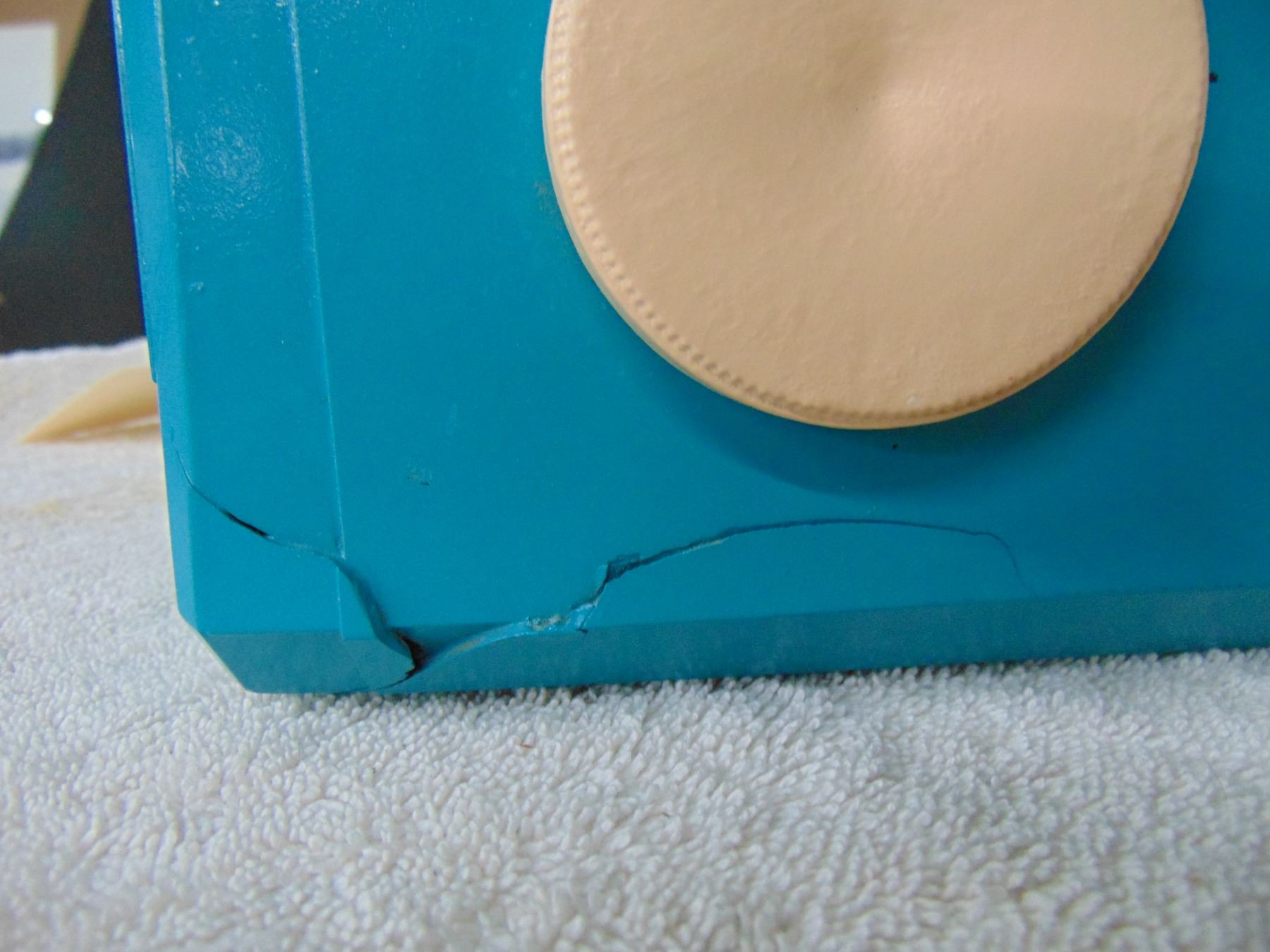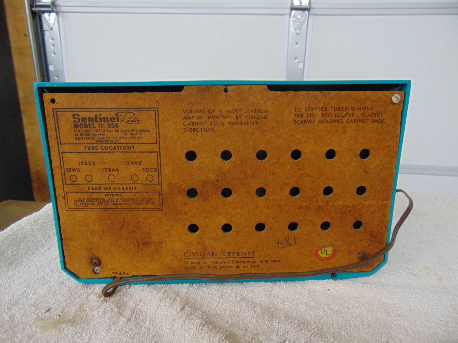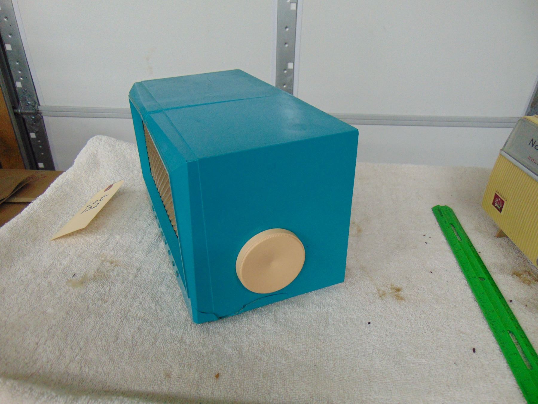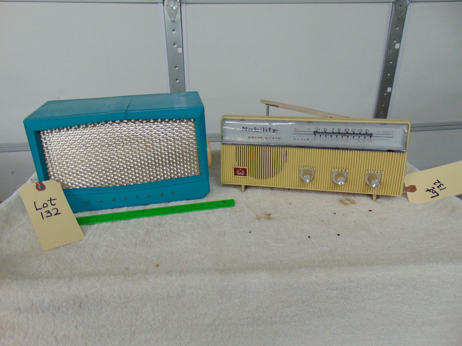 Blue bakelite table set, model 1U-356, break on bottom right hand corner, works; ALSO, Nobility portable transistor