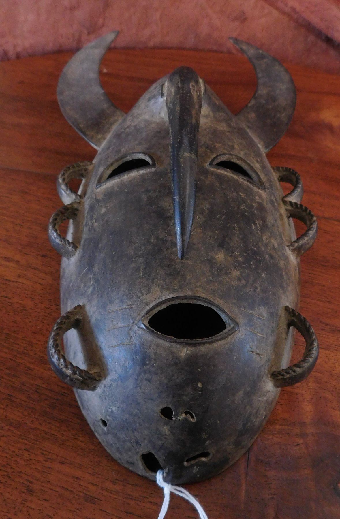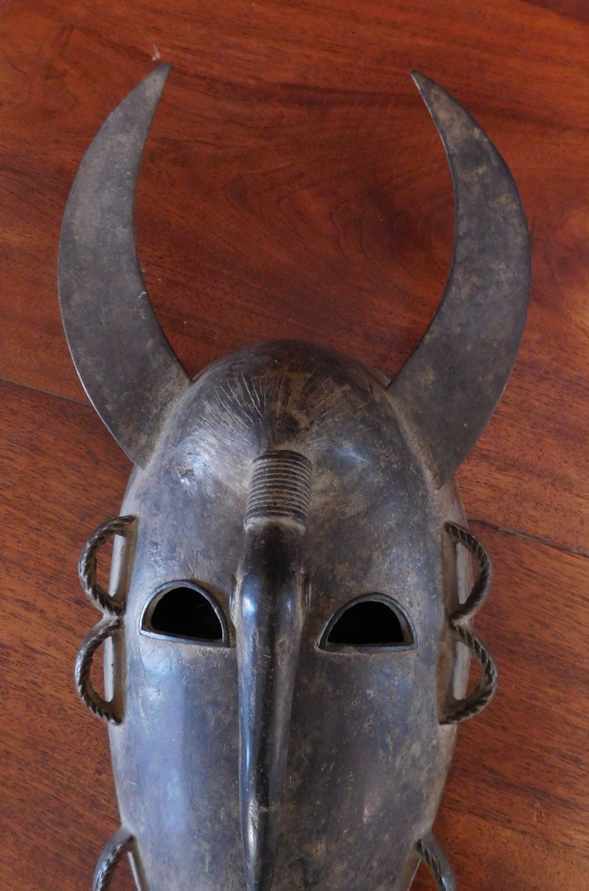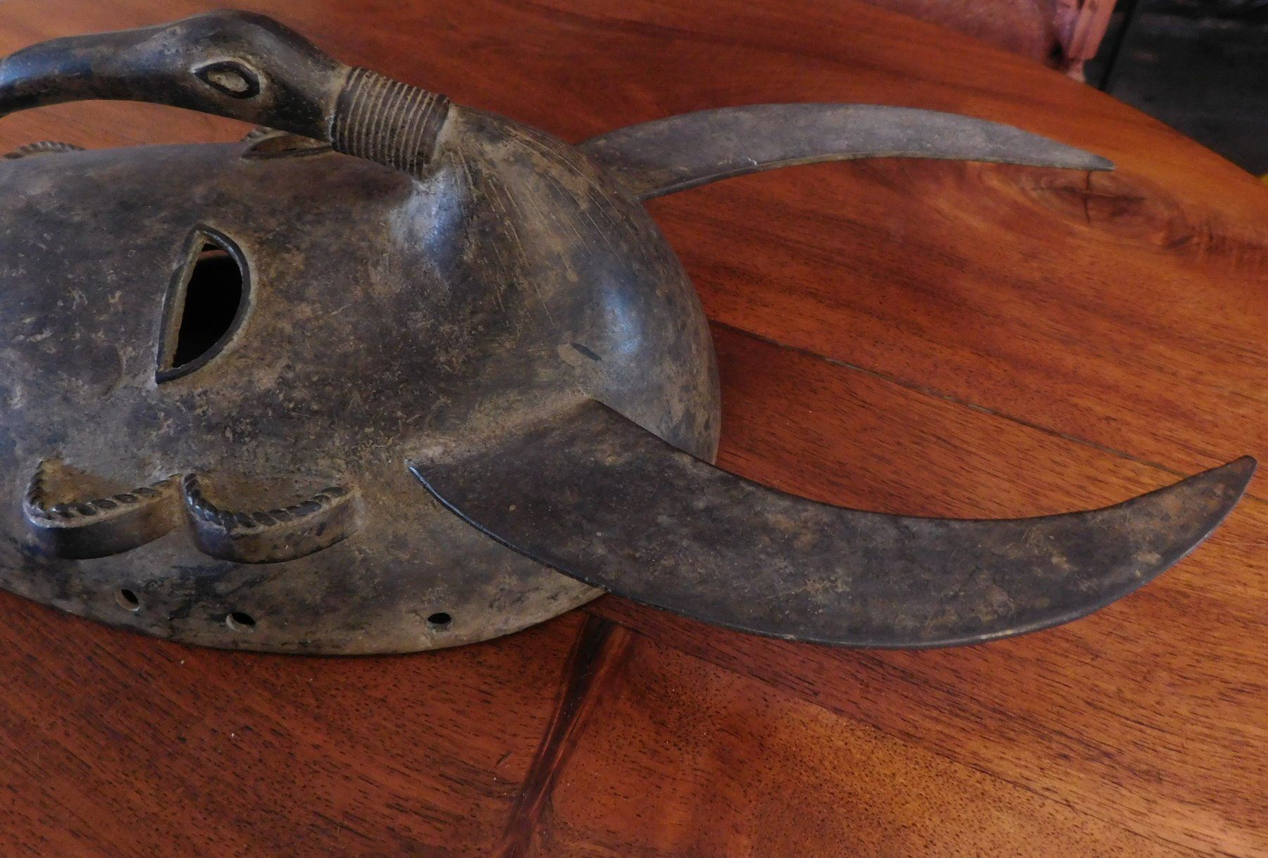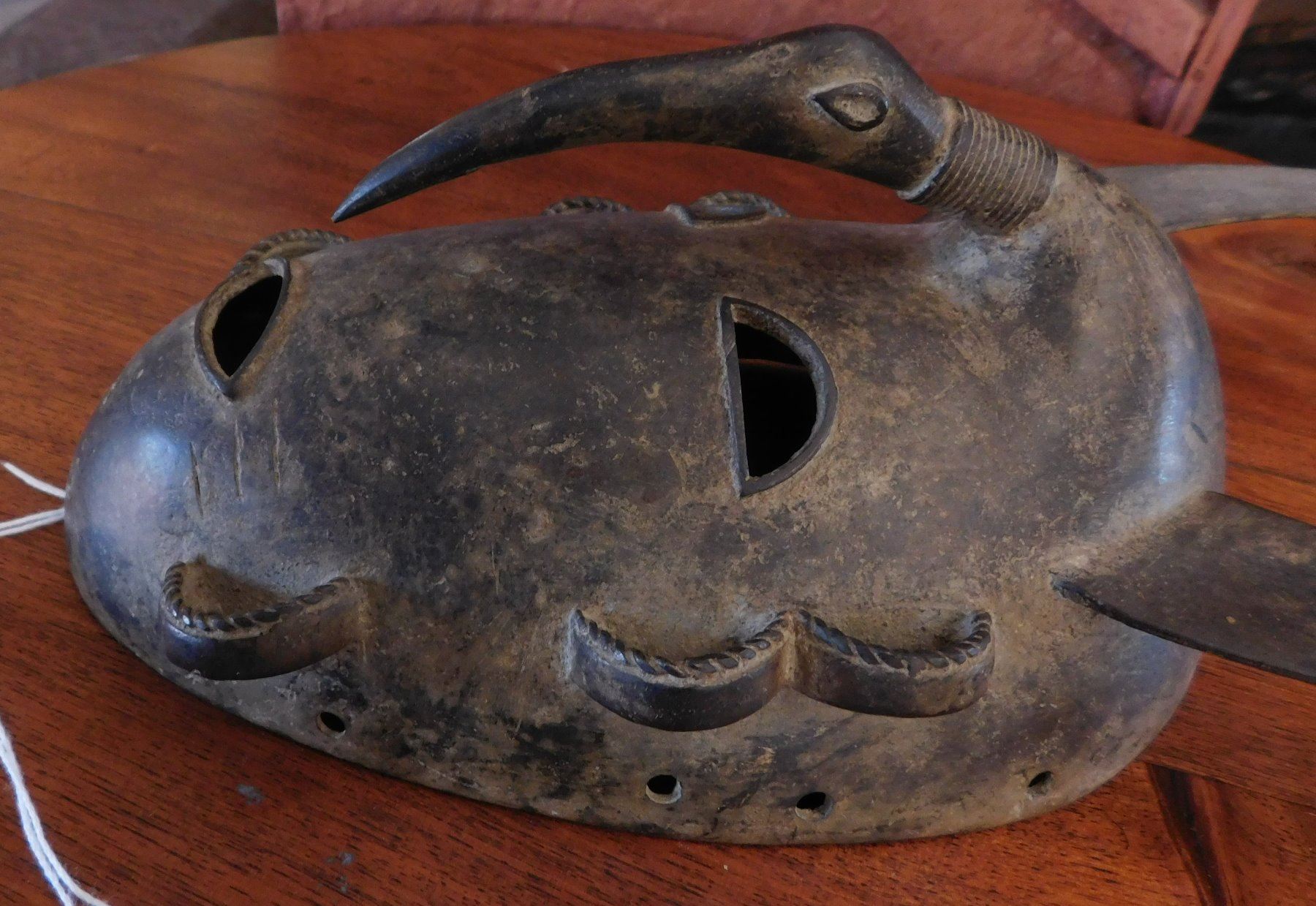 Senufo Bird Mask, 18th century item. Made of brass, the item measures 13" x 5 1/2" x 5". Ivory Coast. Very fine African brass bird mask. Condition: Good, small holes in chin, see images. Shipping: $28.50 w/insurance and signature.