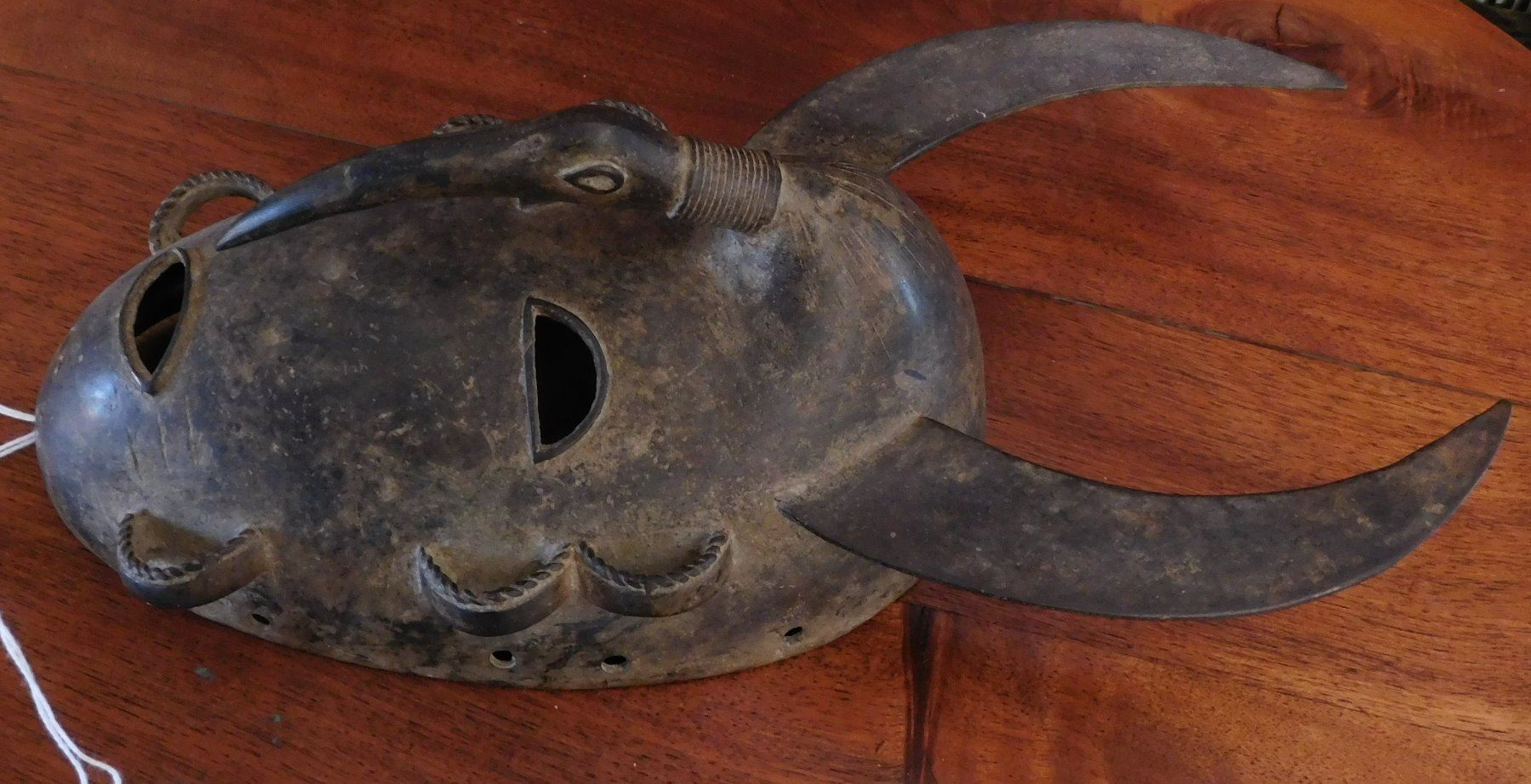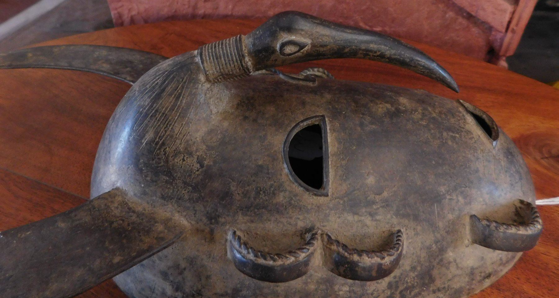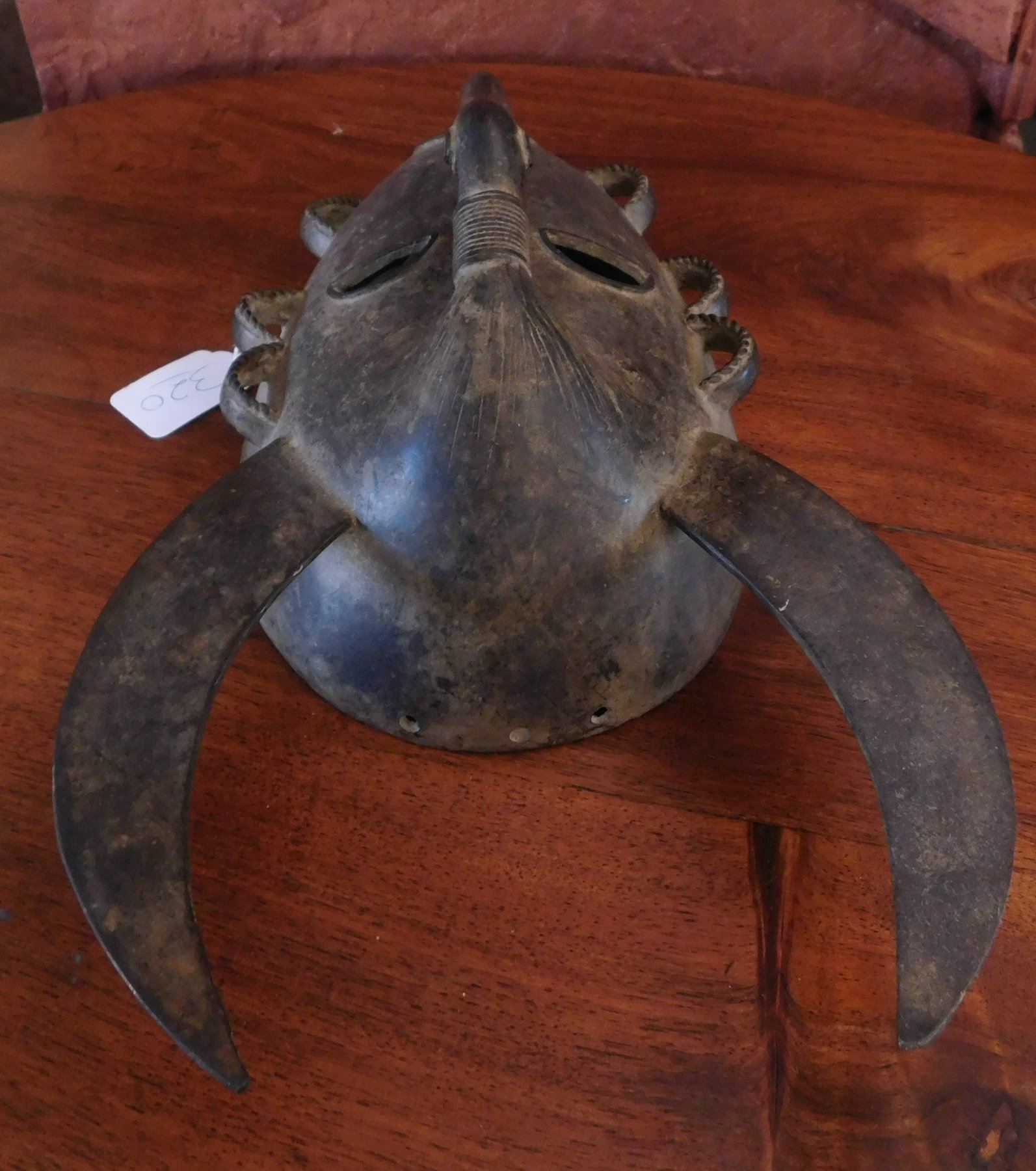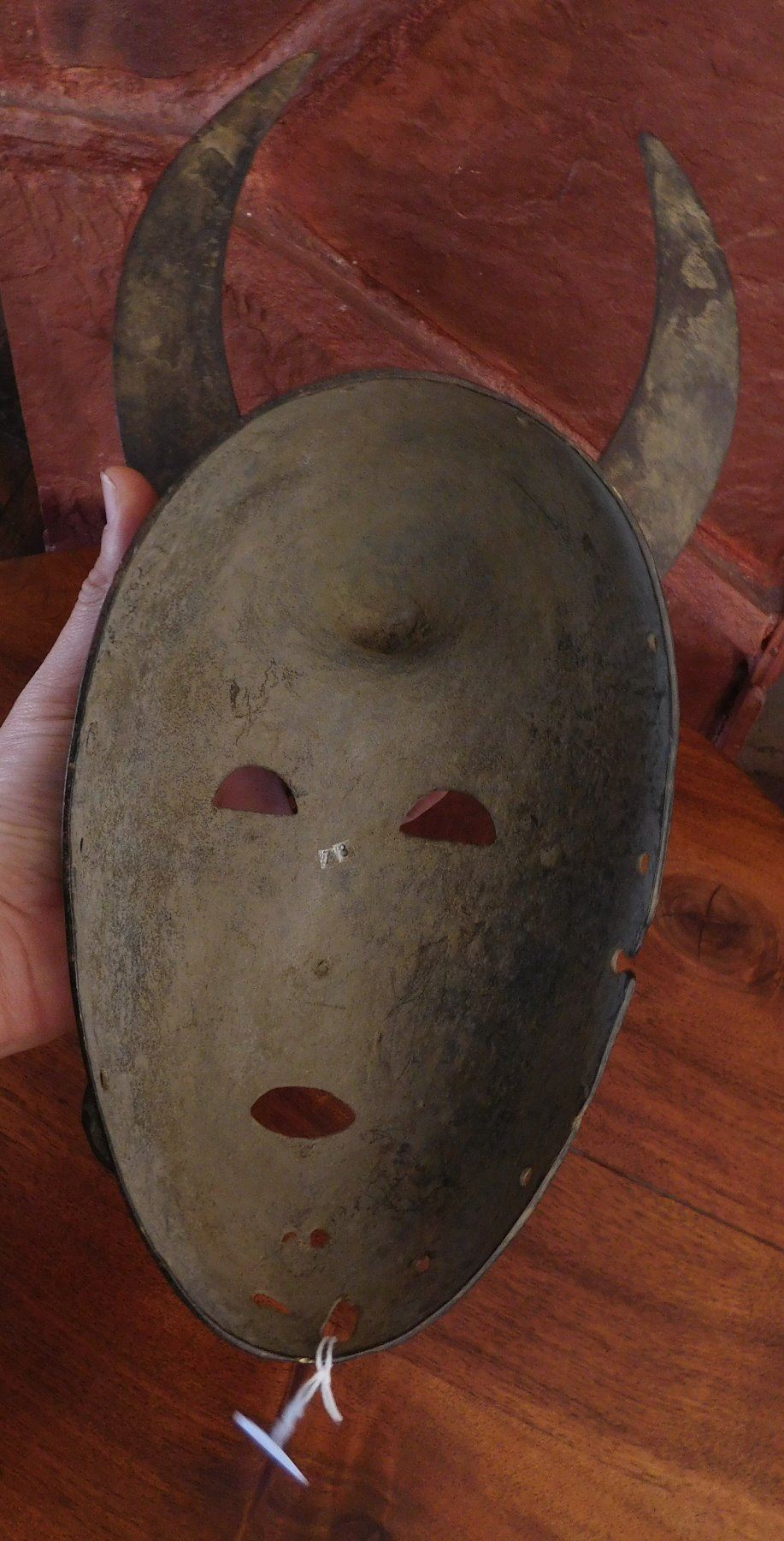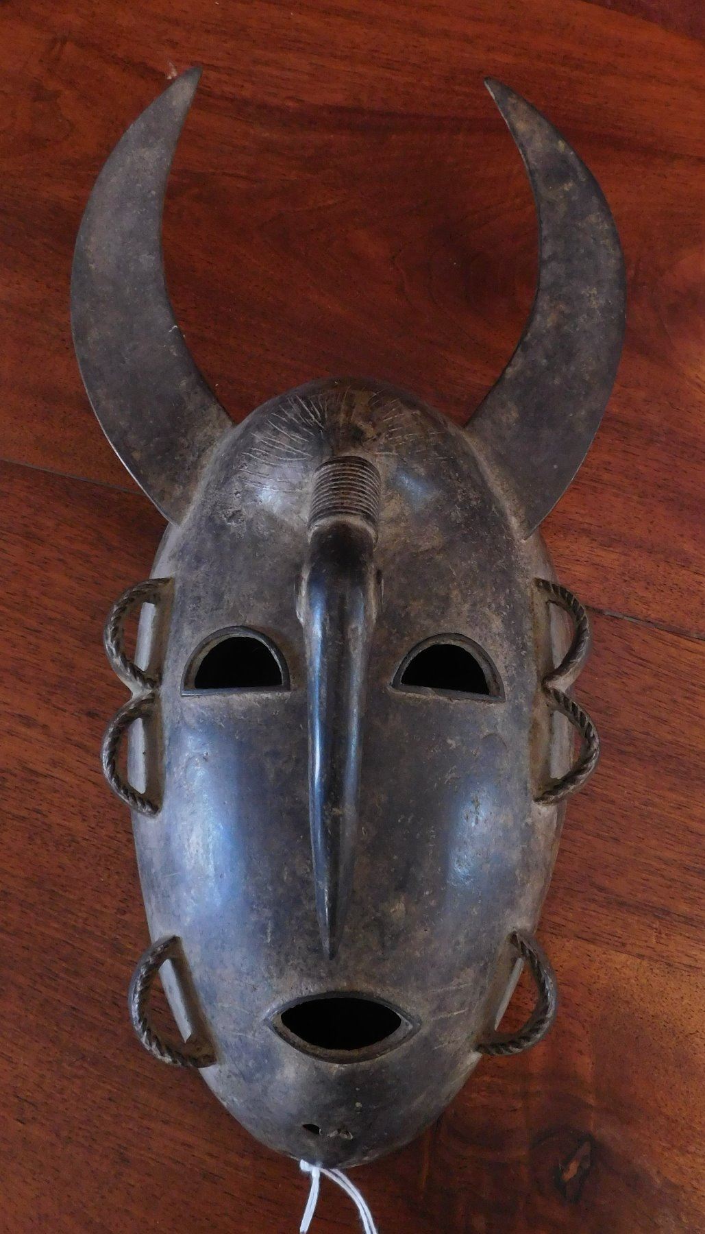 Senufo Bird Mask, 18th century item. Made of brass, the item measures 13" x 5 1/2" x 5". Ivory Coast. Very fine African brass bird mask. Condition: Good, small holes in chin, see images. Shipping: $28.50 w/insurance and signature.