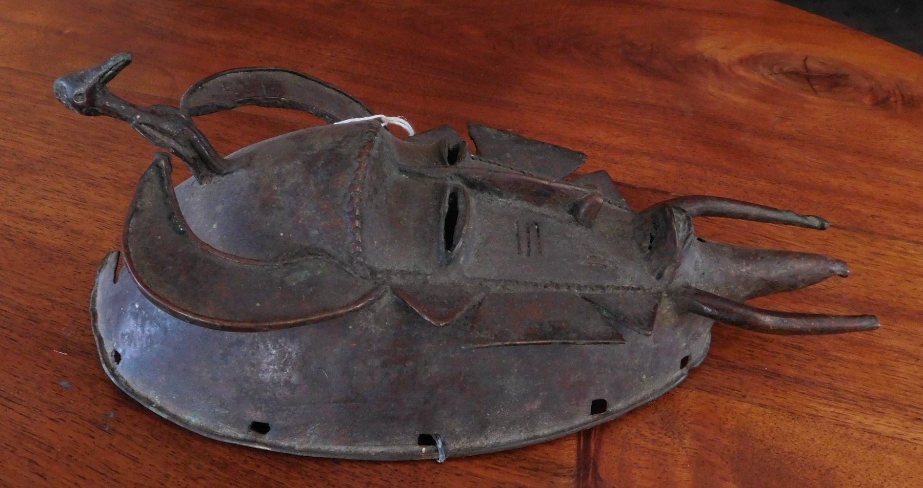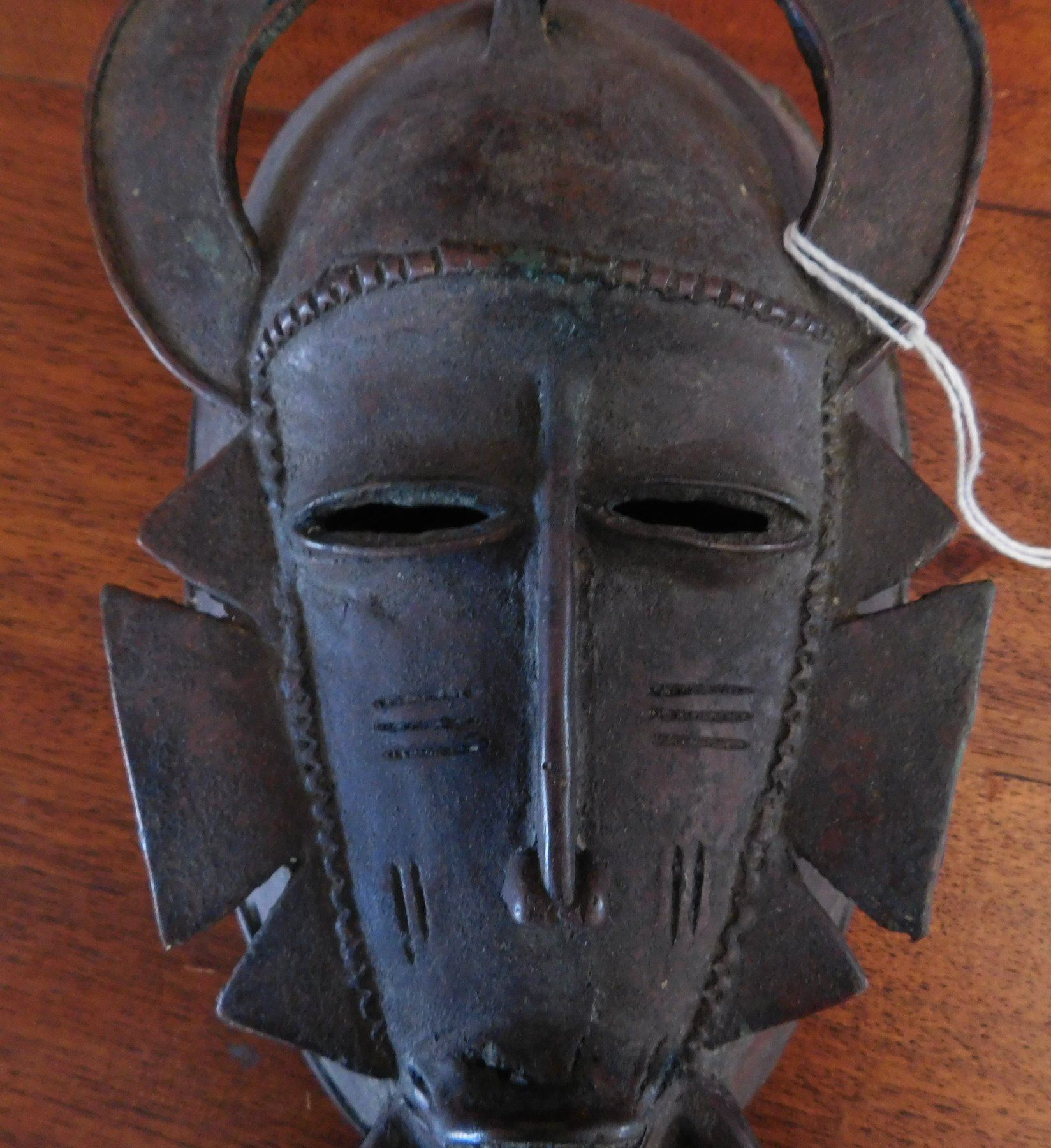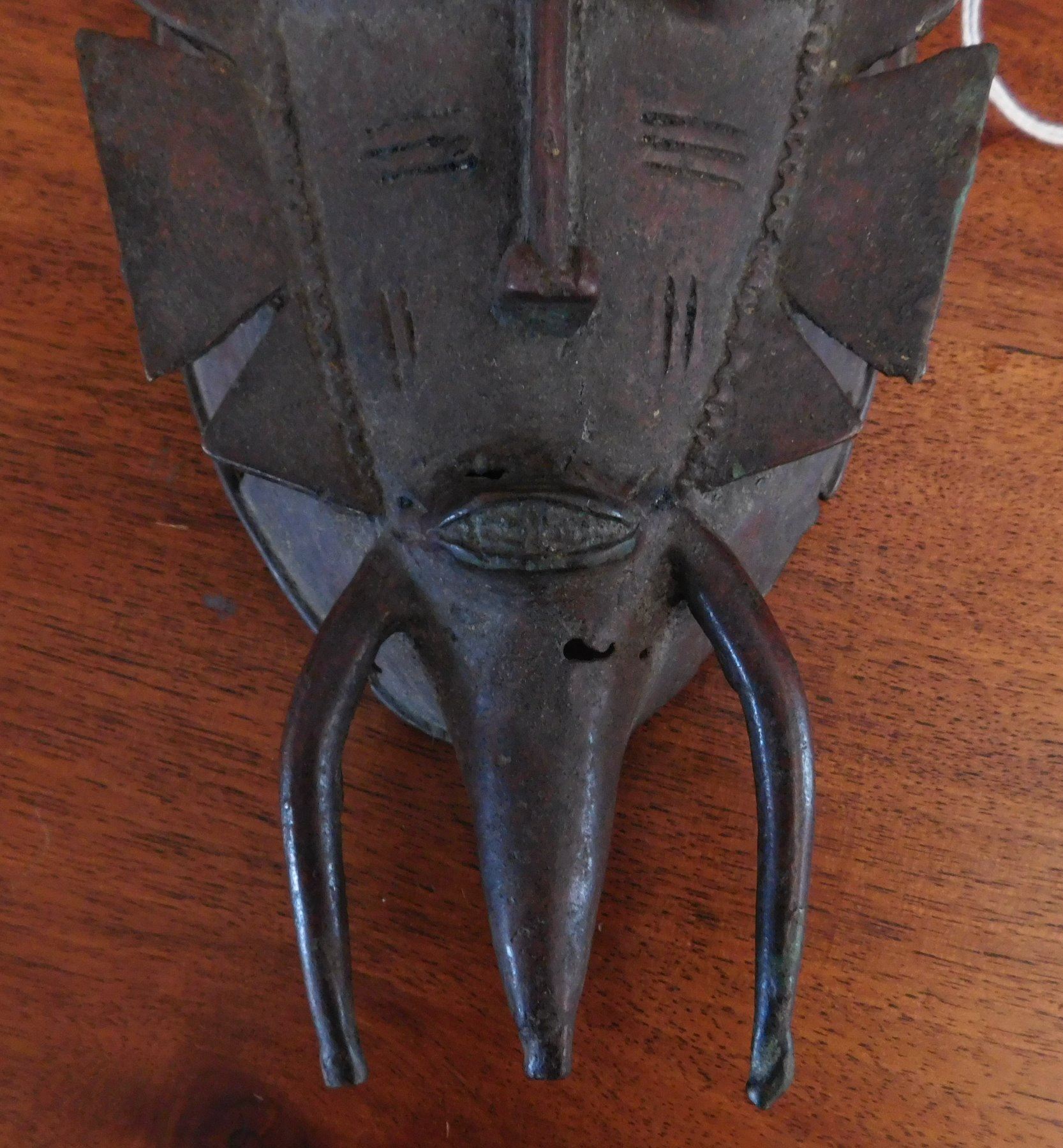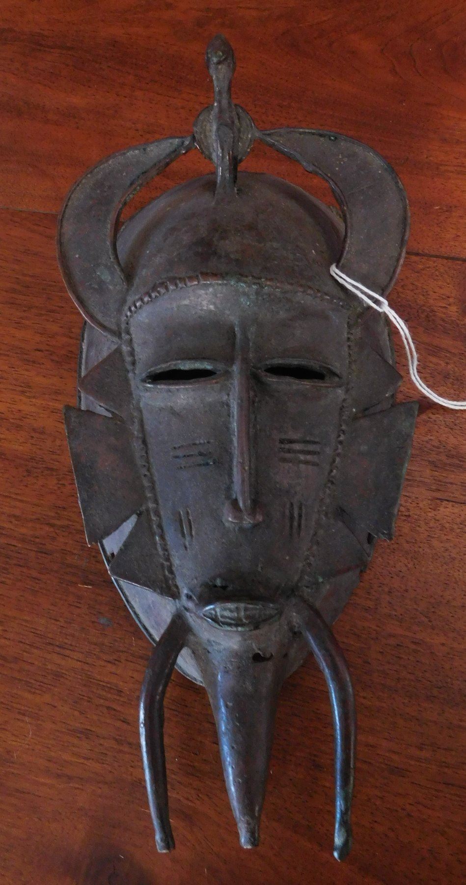 Senufo Bronze Mask, 18th century item. Made of bronze, the item measures 4 3/4" x 10". Senufo, Nigeria. Bird effigy in between horns. Condition: Damage to top, great patina, see images. Shipping: $26.50 w/insurance and signature.