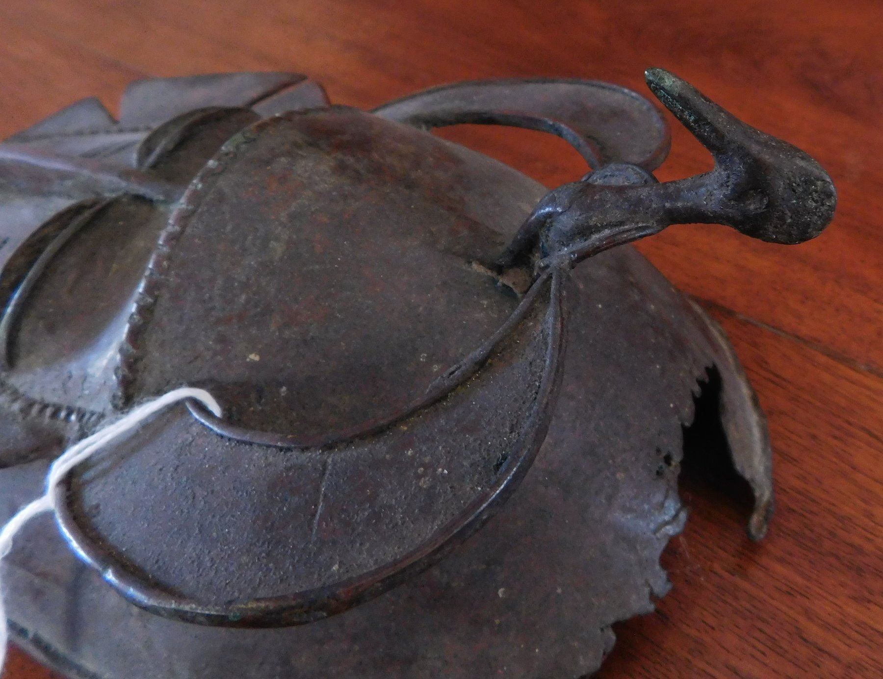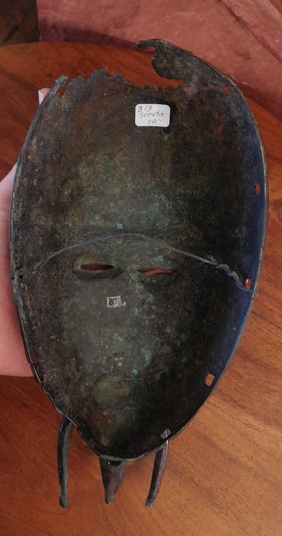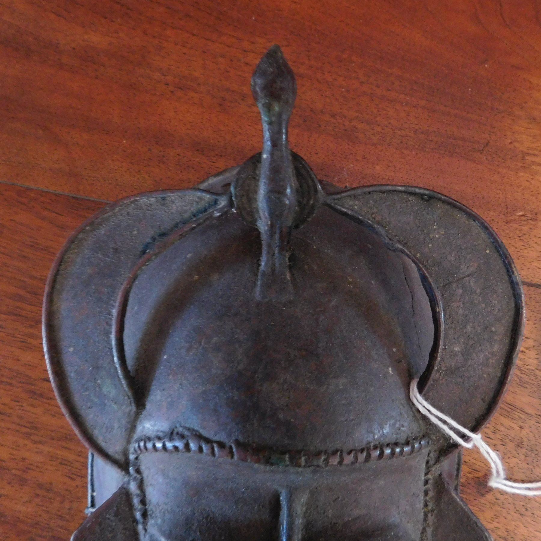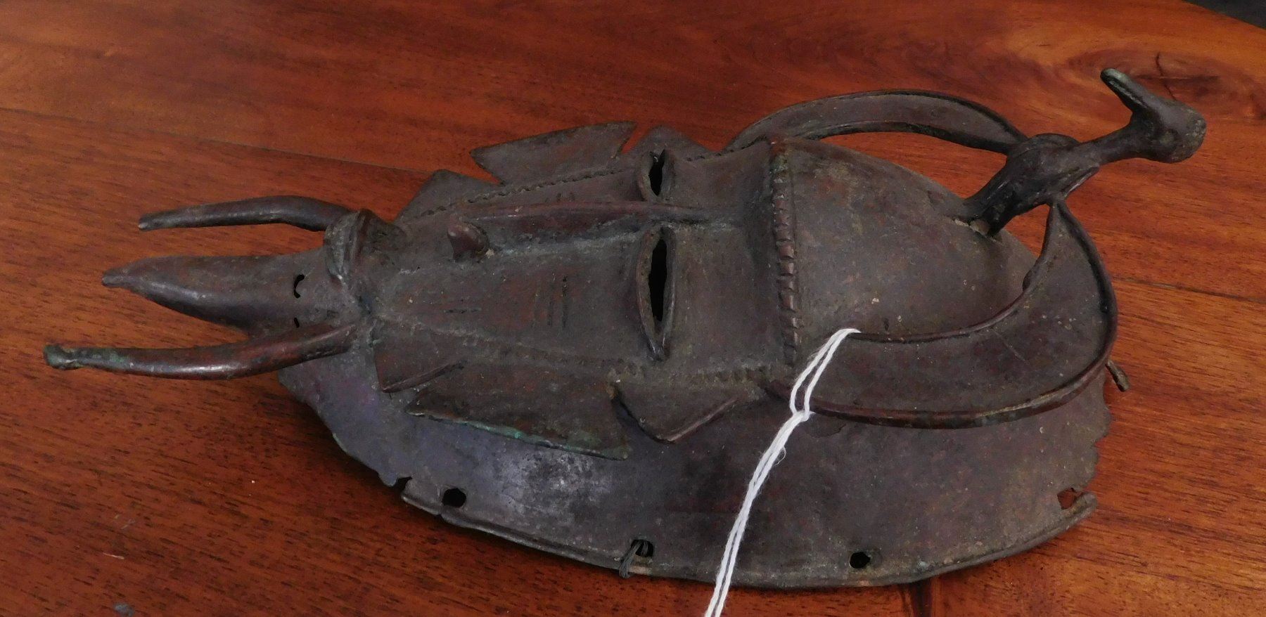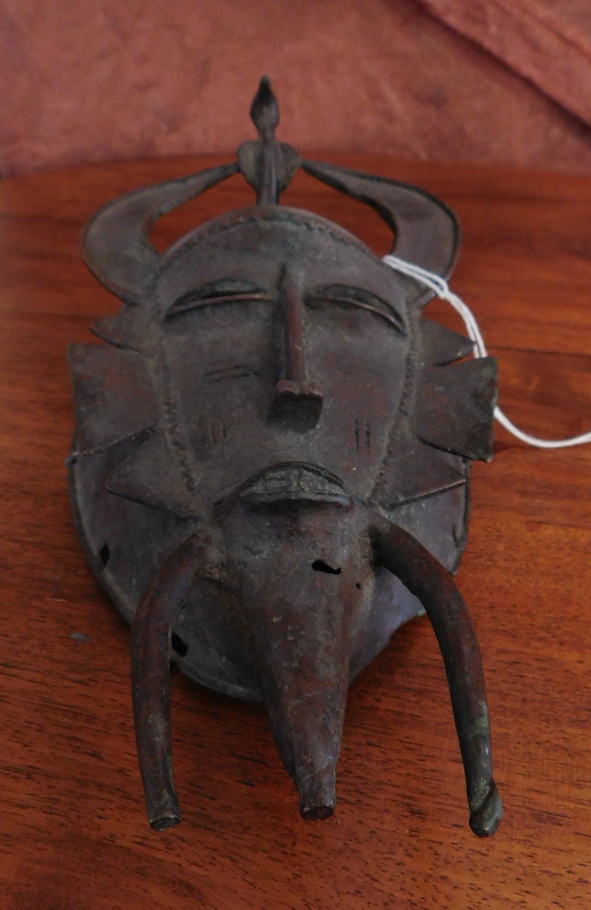 Senufo Bronze Mask, 18th century item. Made of bronze, the item measures 4 3/4" x 10". Senufo, Nigeria. Bird effigy in between horns. Condition: Damage to top, great patina, see images. Shipping: $26.50 w/insurance and signature.