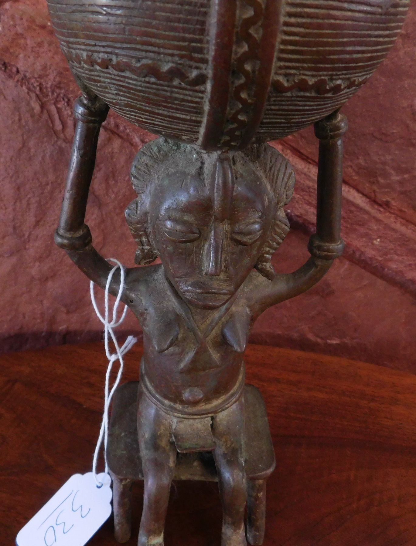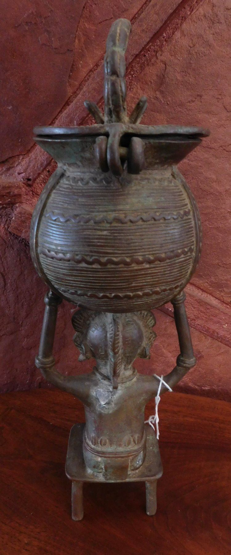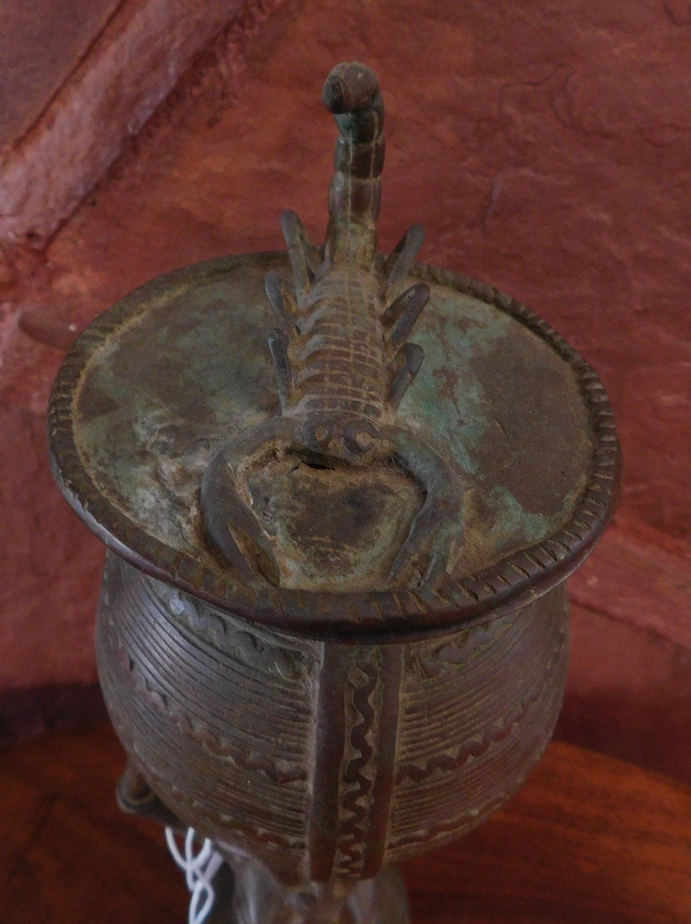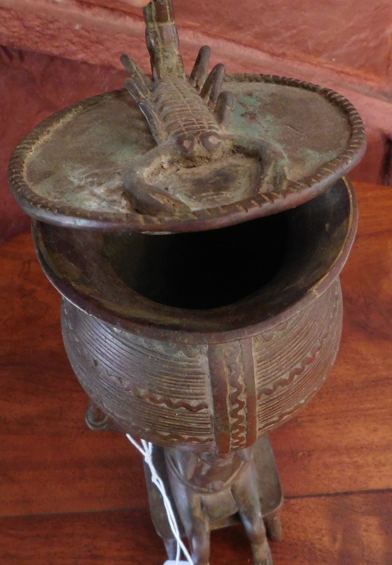Senufo Figure-Holding-Container Bronze, 18th century item. Made of bronze, the item is 12" in height. Senufo, Ivory Coast. Rare item, scorpion on lid of container to keep others from the gold! Condition: Minor repair, see images. Shipping: $30.00 w/insurance and signature, due to value and size.