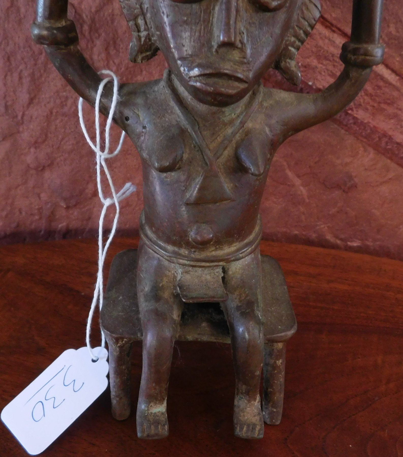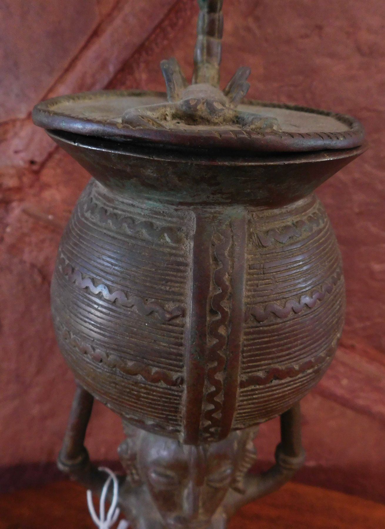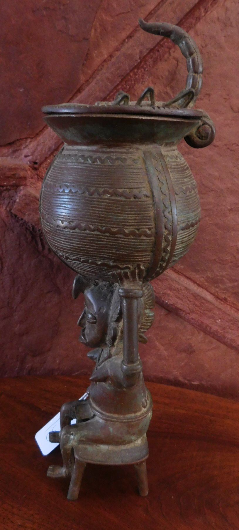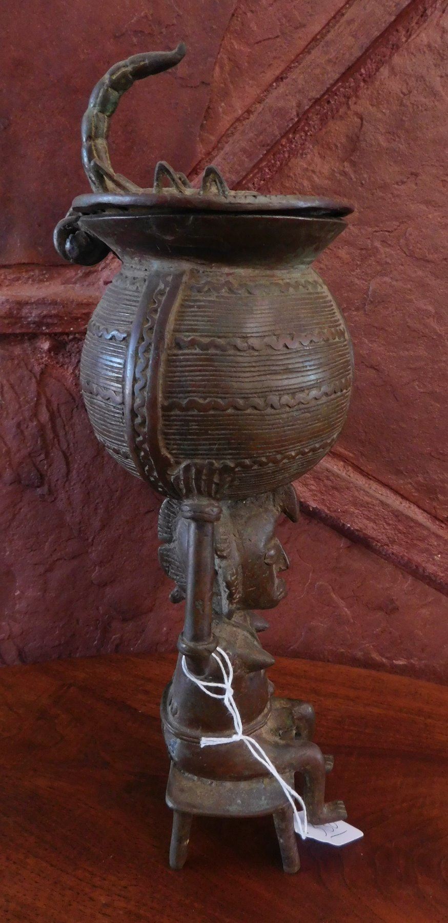 Senufo Figure-Holding-Container Bronze, 18th century item. Made of bronze, the item is 12" in height. Senufo, Ivory Coast. Rare item, scorpion on lid of container to keep others from the gold! Condition: Minor repair, see images. Shipping: $30.00 w/insurance and signature, due to value and size.