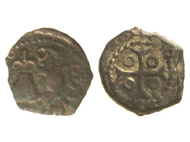 Senyal. AGRAMUNT. Anv.: Monte flordelisado y pellejo. Rev.: Cruz con anillos en espacios. AE. Cru-1010. MBC-/MBC.