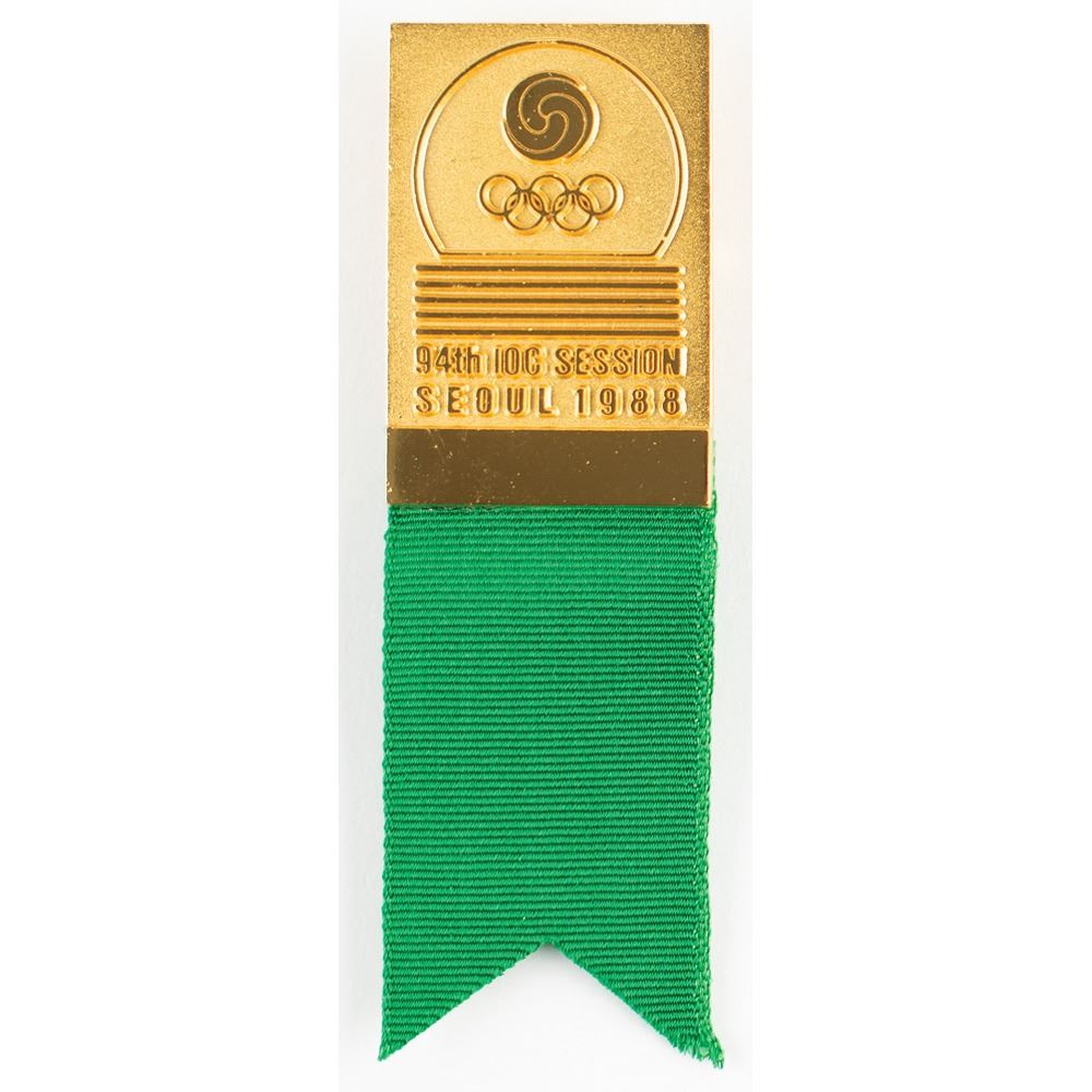NOC badge from the 94th International Olympic Committee session held in Seoul, South Korea, in 1988, measuring 30 mm x 45 mm with green ribbon below, featuring the emblem of the Games of the XXIV Olympiad, with text below: "94th IOC Session, Seoul 1988." At this session, Lillehammer of Norway was selected as the host for the XVII Olympic Winter Games.