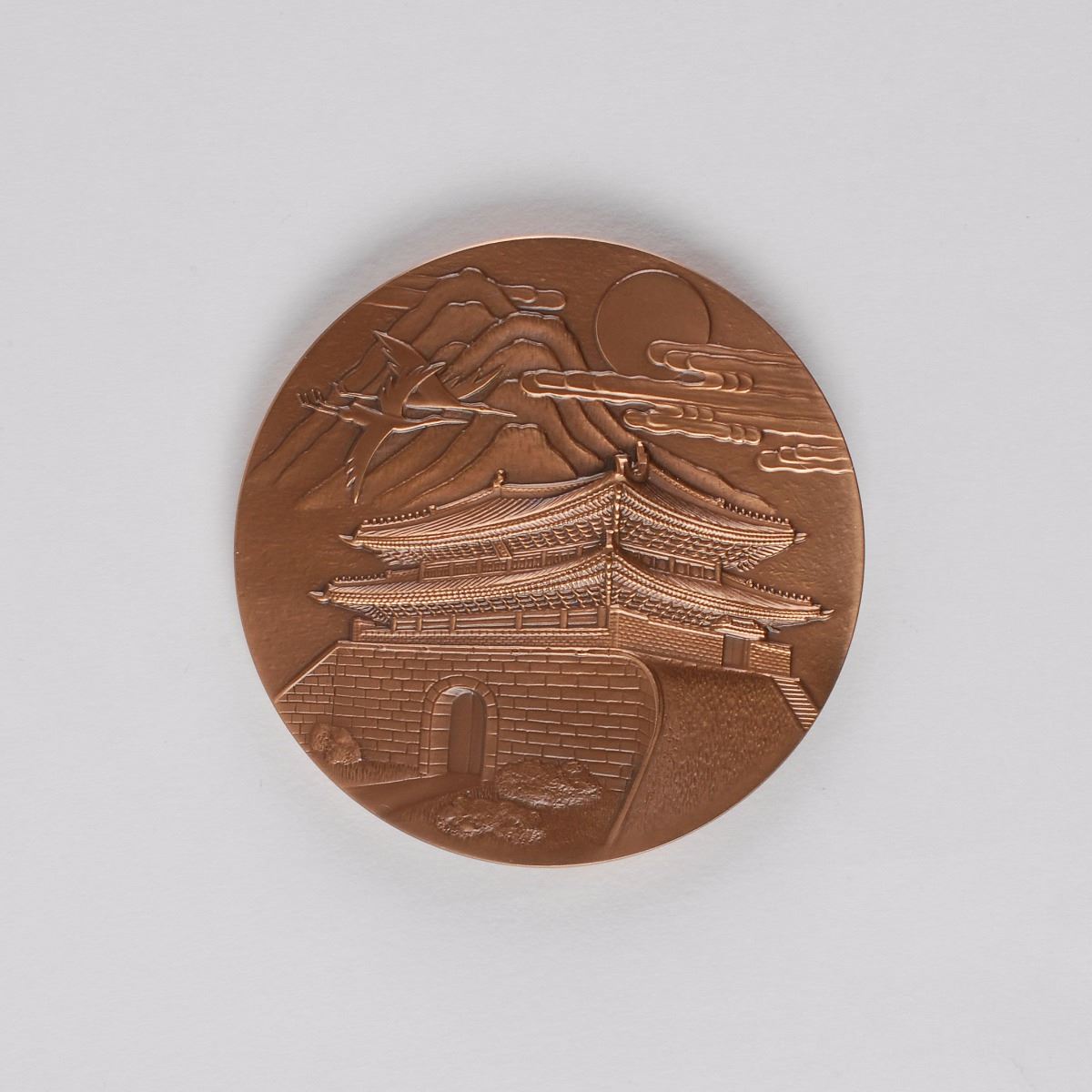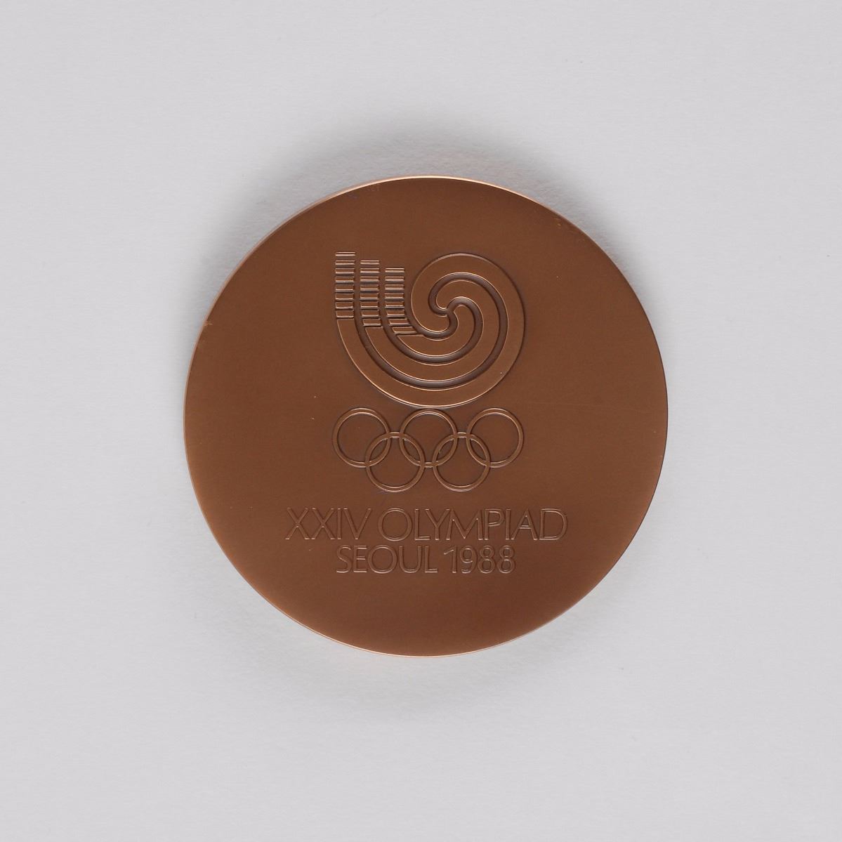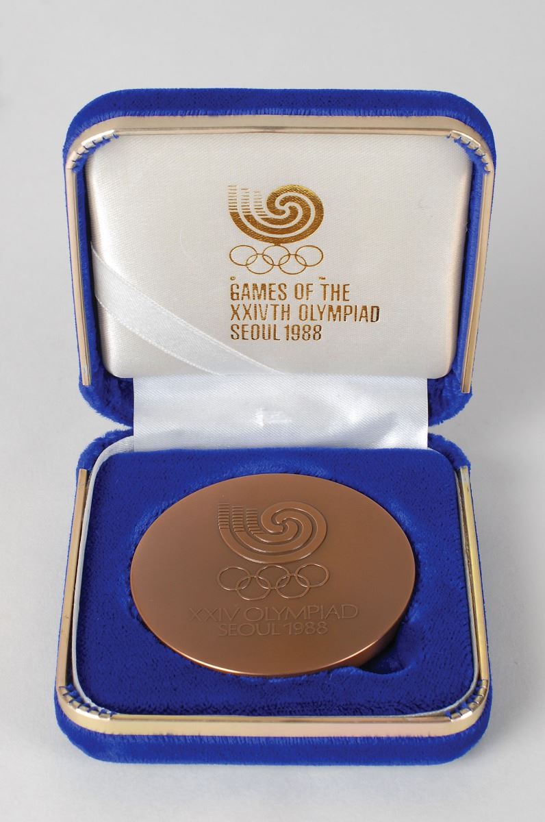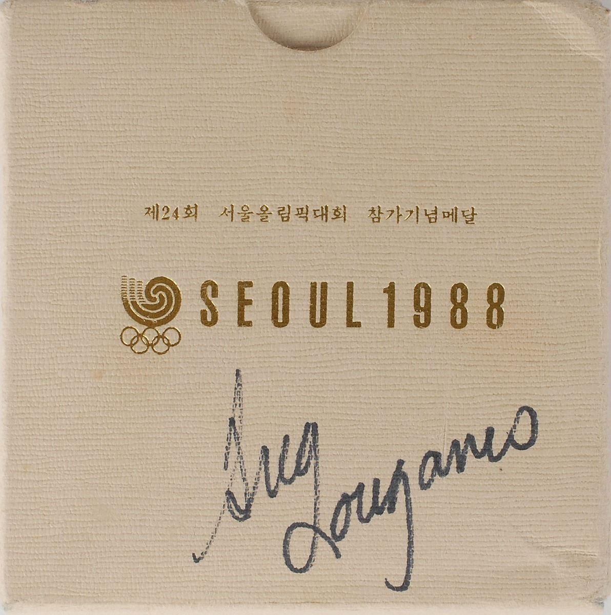 Lovely participation medal issued for the Seoul 1988 Summer Olympics. Bronze, 60 mm, 115 gm, by Kim Kwang-hyun. The front depicts Namdaemun, one of the gates in the Fortress Wall of Seoul, with mountains, clouds, cranes, and the sun; the reverse bears the Seoul Games emblem and reads “XXIV Olympiad, Seoul 1988.” Complete with its original purple velvet case and cardboard box, signed on the latter in black felt tip by Greg Louganis, who won two more gold medals in the three-meter springboard and ten-meter platform at the 1988 Games.