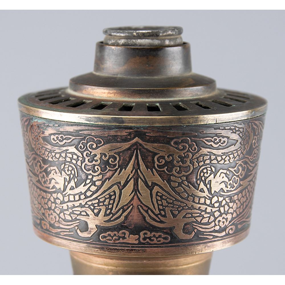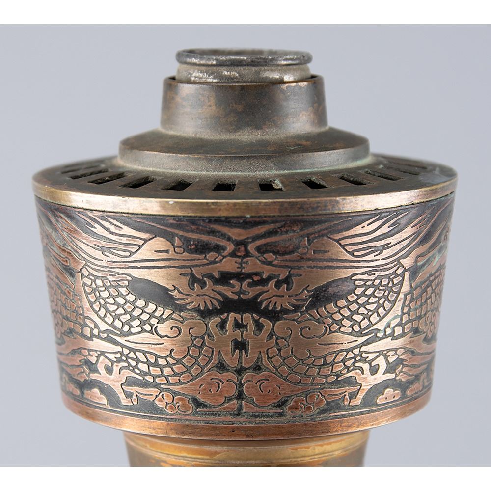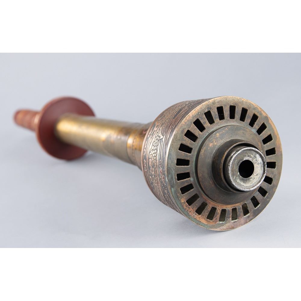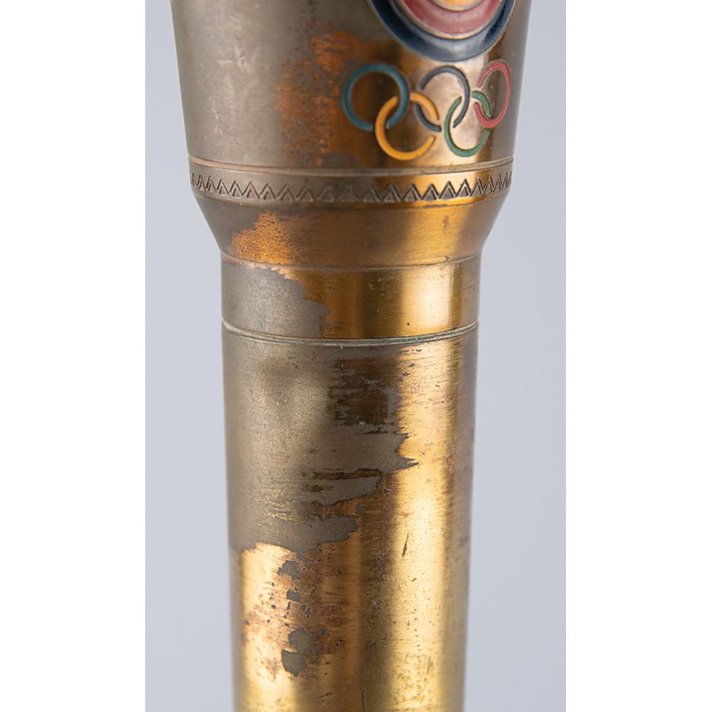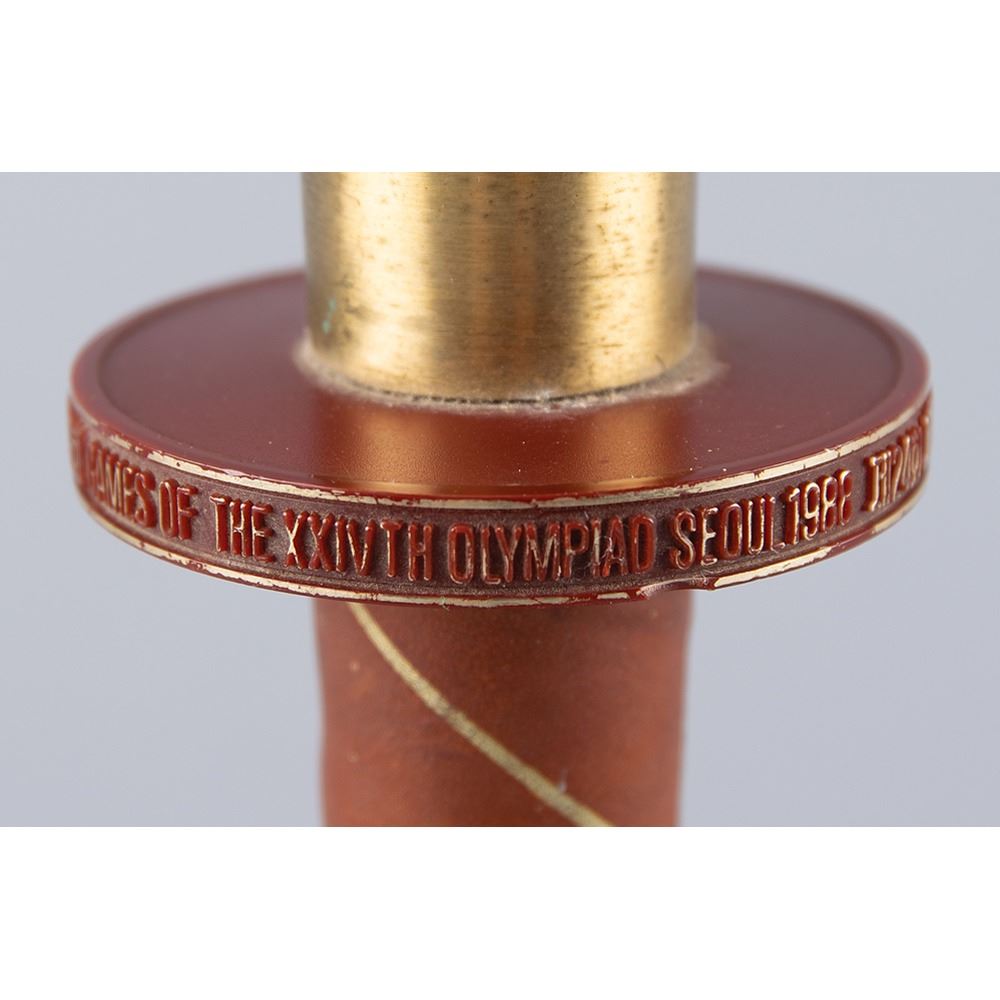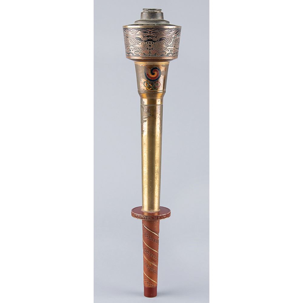 Artfully designed official 1988 Seoul Olympics torch, constructed of metal, copper, leather, and plastic, measuring 20Ë in length and 4Ë at its widest point, designed by Lee Woo-Sung and manufactured by Korea Explosives Co. Ltd. The handle is wrapped in brown leather with a ring above, inscribed, "Games of the XXIVth Olympiad Seoul 1988," in English and Korean. The upper portion of the torch bears a colorful Olympic ring emblem and the top is engraved with an intricate dragon design symbolizing the harmony between East and West; based on the Chinese zodiac, the year 1988 was also the year of the dragon. Complete with its original burner. The torch exhibits significant wear to the metal body, with some tarnishing, rubbing, and discoloration. During the 22-day relay, the Olympic flame traveled from the Greek capital of Athens to Korea's southernmost point, Jeju Island, before making its way north to Seoul in a 4,167 km relay.