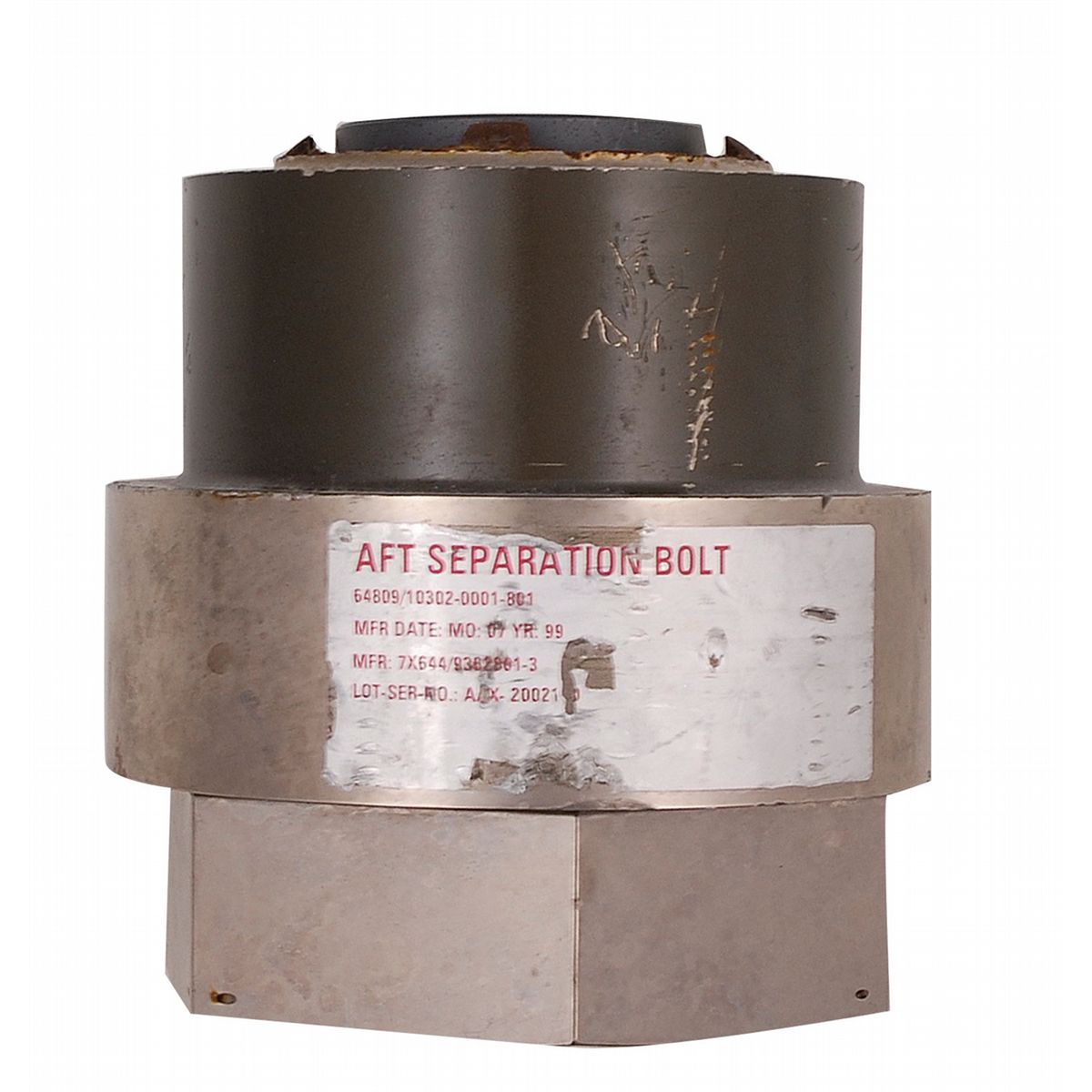 Used for launch Aft Separation Bolt and Screw (not flown), used during the launch of shuttle Atlantis mission STS-104. The two pieces, weighing a combined 56.6 pounds, each measuring approximately 6? in height, with a combined height of roughly 12? after use. Upper portion bears a label indetifying it as “AFT Separation Bolt.” This particular bolt was taken from the Tail Service Mount (TSM) on MLP 2. Two sets of AFT separation bolts are removed each launch from the left and right TSM on the MLP. At launch, only six bolts (no screws) are returned to Kennedy Space Center from SRB Retrieval. No screws survive the ascent into space. The only sets that survive the launch are those used on the TSM on the pad. In fine condition, with expected sheared center. Accompanied by a photocopy of a page from the ACMS Log Book identifying the bolt as being used on STS-104.