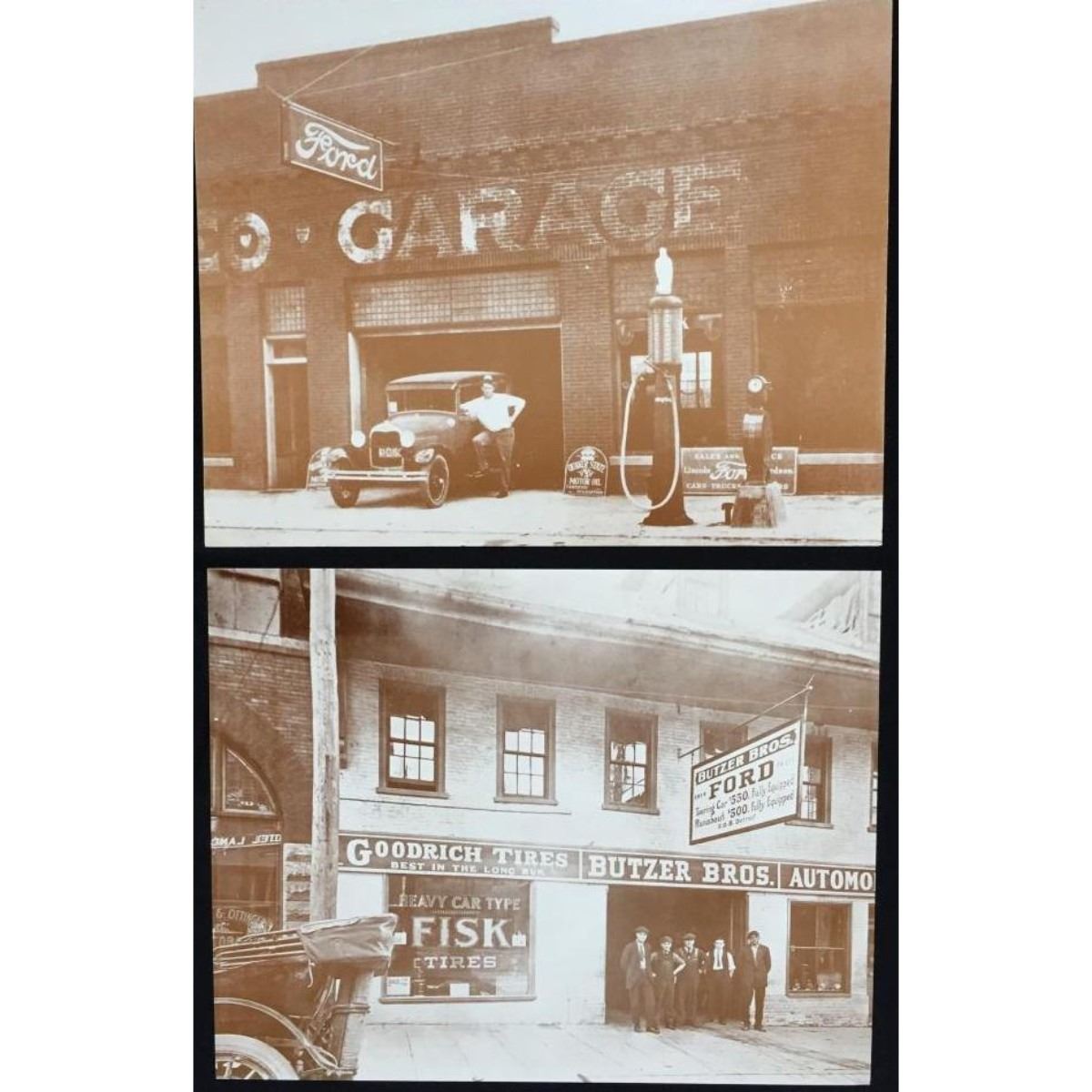 Set of two modern produced sepia tone photo prints on heavy card stock, depicts early 20th century Ford garage scenes. Prints from the early 1990's. Each 11" X 14".