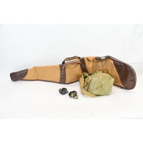 One 41" long soft case, two trigger locks with two keys each, and a small green canvas bag.
