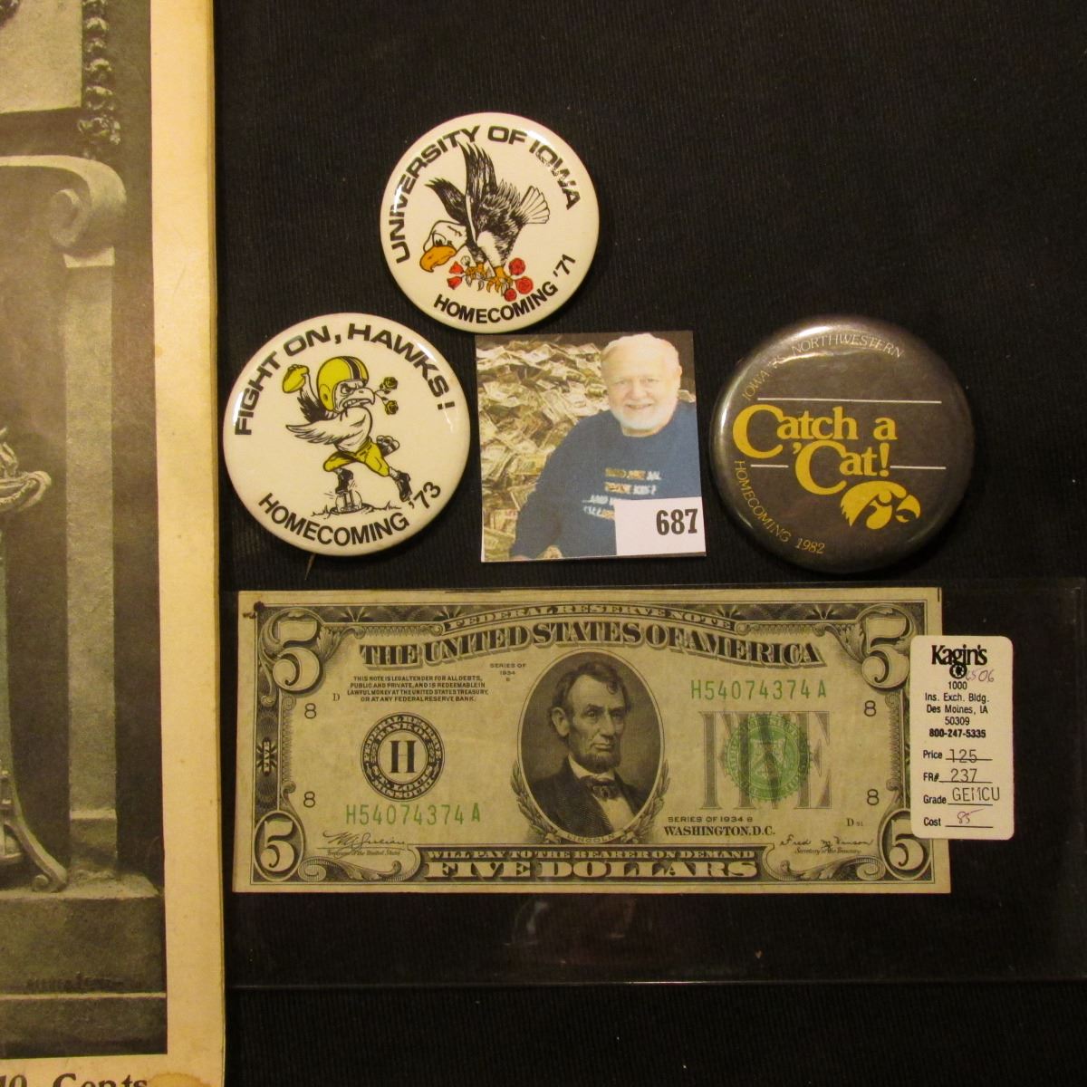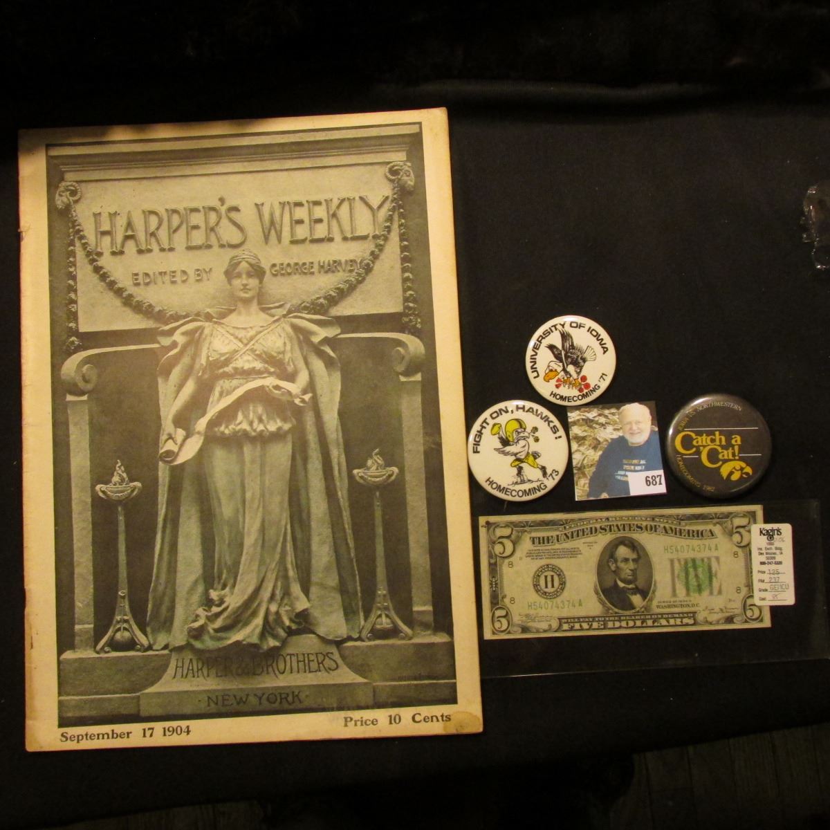 Sept. 17, 1904 "Harper's Weekly" Edited by George Harvey, which 'Doc' thought was quite rare; Series 1934 B Five Dollar Federal Reserve Note from St. Louis, Mo.; & (3) different 1971-82 Iowa Hawkeye Pinbacks.