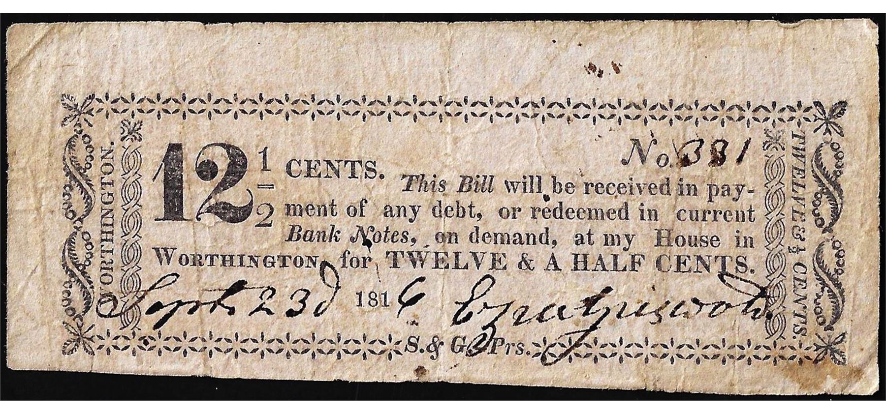 September 23, 1816 12 1/2 cents Ezra Griswold Worthington, Oh Obsolete Note