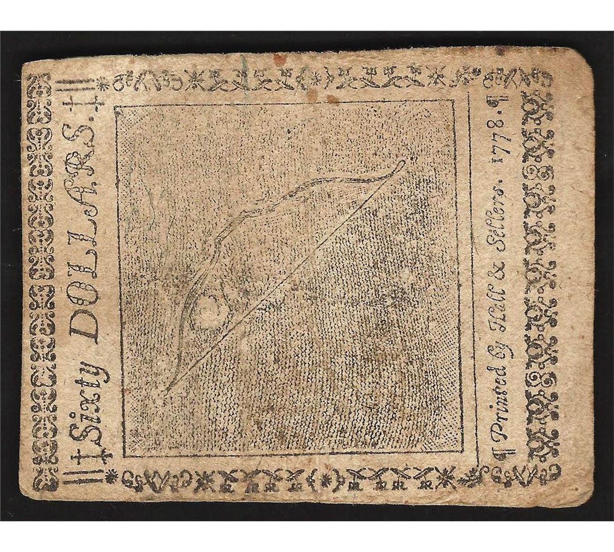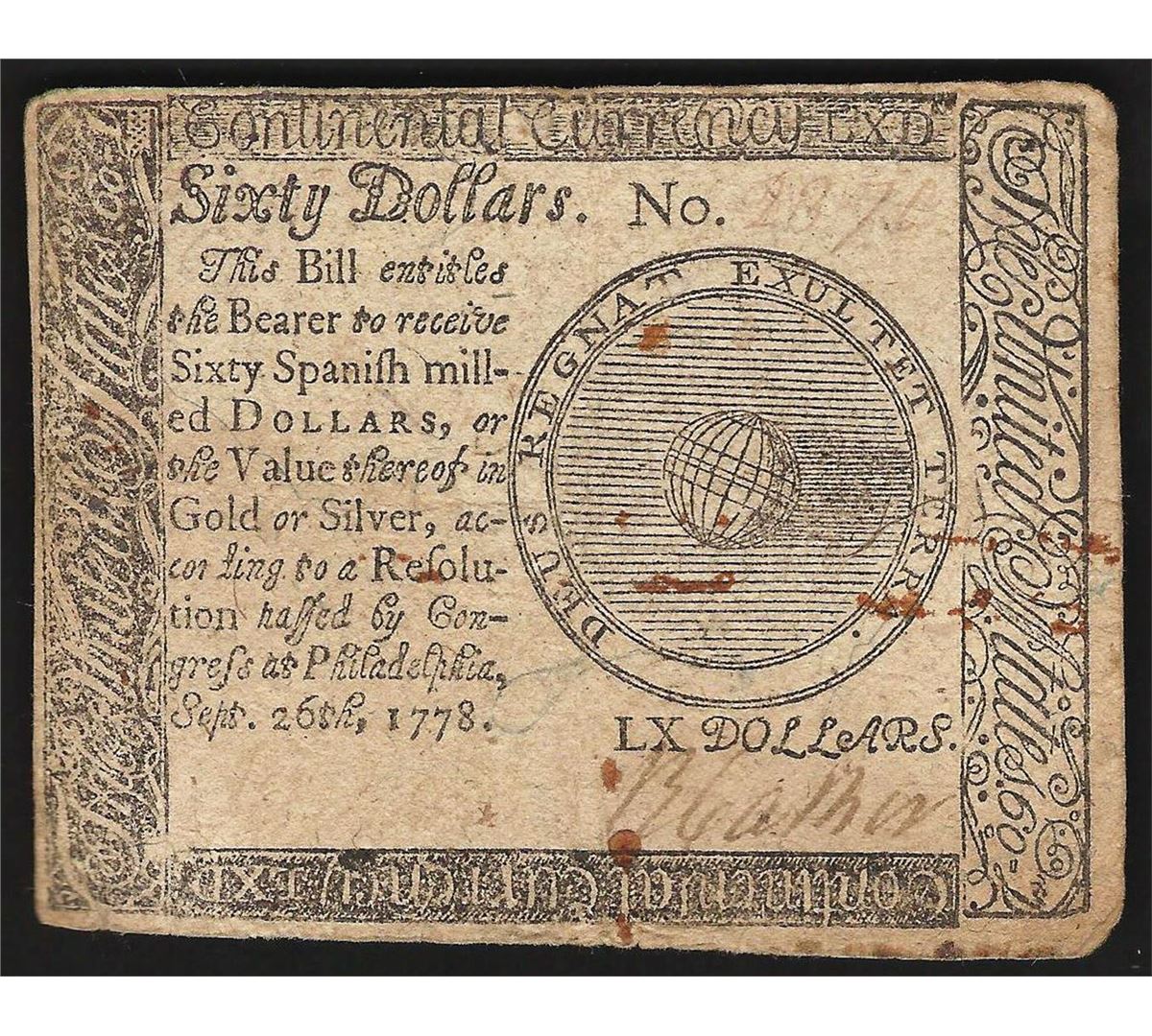 One September 26, 1778 $60 Philadelphia Spanish Milled Colonial Currency Note.
