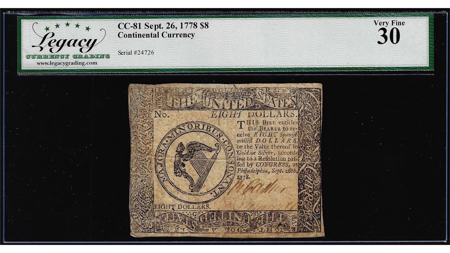 One September 26, 1778 $8 Continental Currency Note CC-81 Legacy Very Fine 30. Legacy Graded.