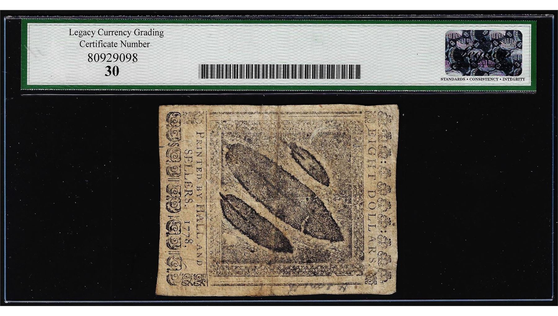 One September 26, 1778 $8 Continental Currency Note CC-81 Legacy Very Fine 30. Legacy Graded.