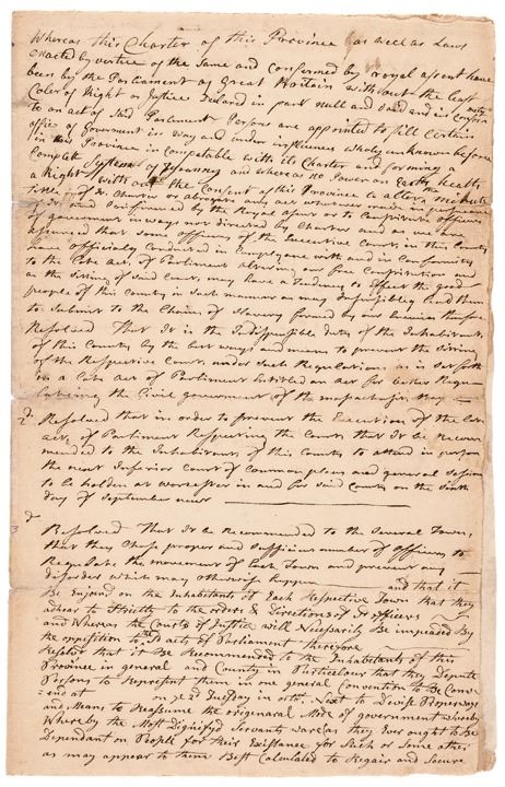 “Whereas this Charter... as well as laws enacted by virtue of the same… by the Parliament of Great Britain without the least coler of right or justice… Declared in part null and void… forming a Complete System of Tyranny and whereas no Power on Earth hath a right without the Consent of this Province to alter the minutest tittle of the Charter… as the sitting of said Court, may have a Tendency to Effect the good people of this county in such manner as may Insensibly lead them to submit to the Chains of Slavery… Therefore Resolved that it is the Indispensable duty of the Inhabitants of this County … to prevent the sitting of the Respective court… the Inhabitants of this County will attend in person the next inferior court of common pleas and general session… properly Armed to repel any hostile force which may be employed…”