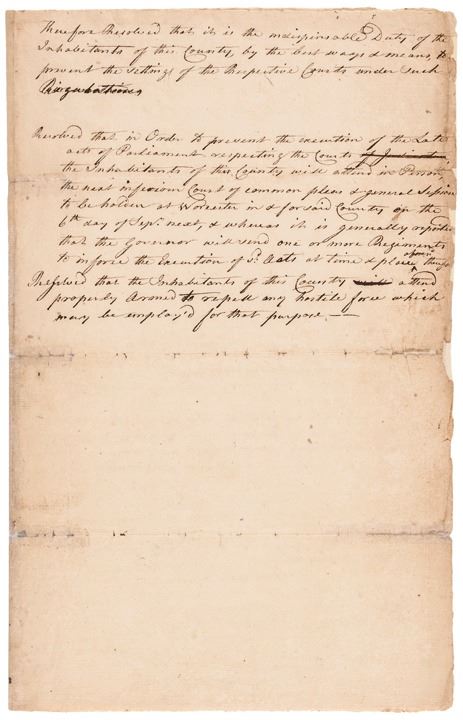 A remarkable, historically important September 5, 1774 Manuscript Document, measuring 8.25” x 13”, 4 pages, Grafton, (MA) in defiance of the British imposed “Intolerable Acts.” This Manuscript is well written in rich dark brown and is easily readable on clean period laid paper having a few small archival reinforcements along the fold edges and spine. It starts with a copy of “Resolves” issued on August 31, 1774, in response to one of the Intolerable Acts, by a convention of the Worcester County Committees of Correspondence.