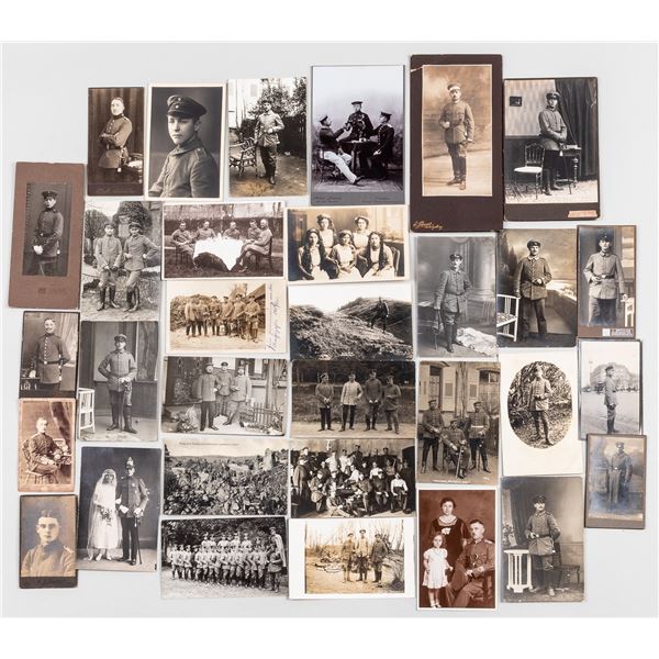 Lot of 32 cabinet cards and postcards of German WWI soldiers. Photos date from early 1900s to 1933. Some photos have inscriptions on verso. Approx. 3.