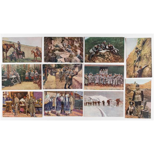 Lot of twelve Austrian postcards from WWI showing soldiers on the battlefield, Gesellschaft fur volkstumliche Bildkunst, Berlin, not dated, 3.5 x 5.5