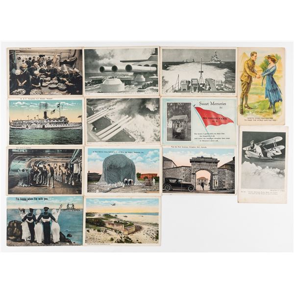 Twelve American postcards showing Naval soldiers and vessels addressed to women of the Bell family, 3.5 x 5.5 inches. Some postcards are postally used