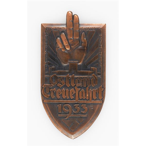Large plaque to commemorate the Ostland Treuefahrt. Initials of N.S.K.K. at top edge. Plaque has a swastika and dated 1933. On the back, the maker...