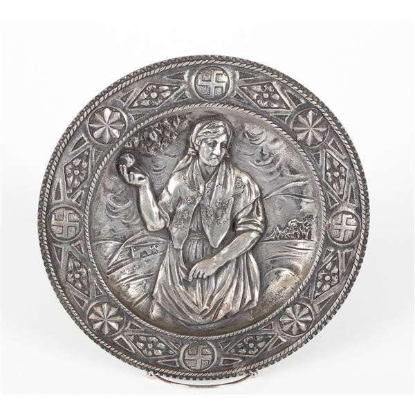 Swastika pewter wall decoration plate decorated with four swastikas around the rim of the plate. Engraved 'Navarro Bilsac - A.S.A.' Verso ha...