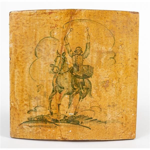 THIRD REICH PAINTED STOVE TILE Large German stove tile decorated with a German army drummer cavalryman painted in green onto the yellow glazed ceramic