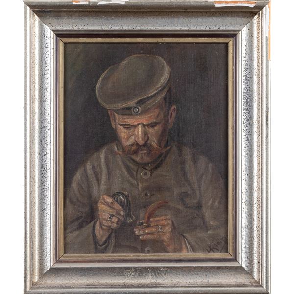 Painting of a German WWI soldier in uniform filling a pipe executed on wood board with a linen pattern. Signed in the bottom right corner 'H. Kl...